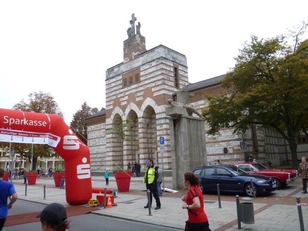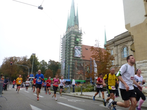 Auf der anderen Straßenseite kommen die Läufer von der ersten Ulmer Stadtrunde zurück. Die Kapellen, die hier unterhalten, können wir auf dem Rückweg erneut hören. Die sind clever platziert. Rechts sehen wir das CongressCentrum. Auf der Münchener Straße erreichen wir nach wenigen Minuten die St. Georgs-Kirche, die gerade außen renoviert wird. In den Jahren 1902 bis 1904 wurde sie als katholische Garnisonskirche errichtet.