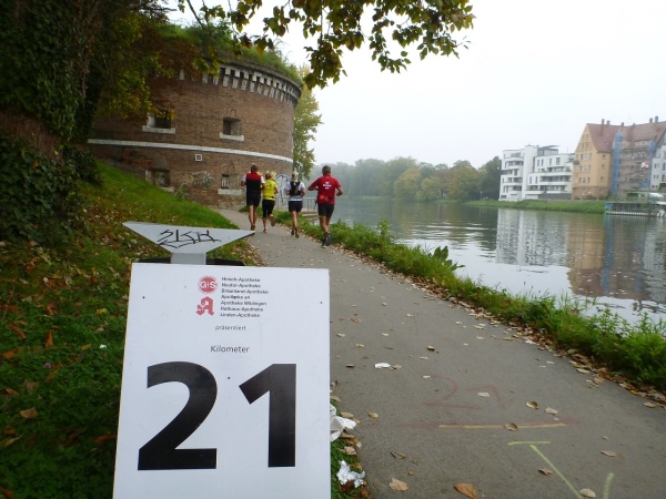 Durch unsere Spritztour gewinnen wir ein paar Höhenmeter und laufen nun hoch oben auf der Stadtmauer. Unten sehen wie das hintere Feld auf der Halbmarathonstrecke auf ihrem letzten Kilometer dem Münster entgegeneilen. Uns führt nun die Strecke auf einem Radweg unter der Adenauerbrücke und unterhalb des Galgenberges in die Donauauen westlich der Stadt. Ein, zwei Personenzüge sind auf den Gleisen rechterhand unterwegs und von der Bundesstraße 311 hören wir Verkehrslärm. Auf der anderen Donauseite erkenne ich kurzzeitig einen Marathonläufer.