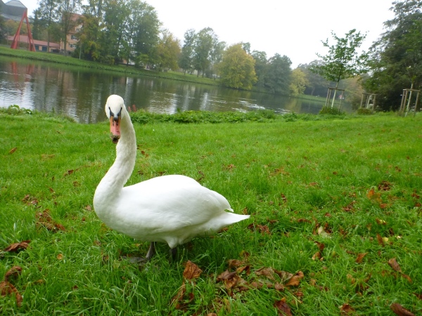 Es folgt das gut vier Kilometer lange Pendelstück, das uns fast bis zur Donauhalle führt. Auf dem Grünstreifen sehe ich ein paar Schwäne. Mich reitet der Schalk, ich will einen übers Gefieder streicheln. Der Schwan faucht und läuft auf mich zu. Ich haue ab, denn die können zwicken. Frühzeitig kommt mir dann der 3.45er Zielläufer auf der anderen Seite entgegen, rund einen Kilometer ist er mit seiner Gruppe voraus.