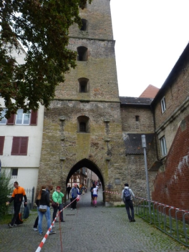 Zurück an der Streckentrennung dürfen wir eine kleine Runde am Metzgerturm drehen. Der Turm ist ein noch heute erhaltenes Tor der früheren Stadtmauer. 1340 wurde der 36 Meter hohe Turm errichtet. Und der ist, so sagt man, ganz schön schepps (schief). Über 2 Meter beträgt die Abweichung zur Senkrechten an der Spitze des Turms. Nur der Schiefe Turm von Pisa ist noch ein wenig mehr aus dem Lot. Der Sage nach entstand die Turmneigung dadurch, als sich dort eingesperrte „wamperte“ Metzger aus Angst vor einer Strafe in die Ecke drängten, als der zornige Bürgermeister eintrat. Die haben minderwertiges Fleisch verkauft und das gute selbst gefressen.