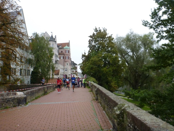 Unser weiterer Weg führt uns nun durch den Wiblinger Wald und zur Illerbrücke. Jenseits der Iller sind wir wieder in Bayern. Ich weiß nicht mehr, wie oft wir mittlerweile die Landesgrenze überschritten haben. Zwei, drei Kilometer verläuft nun die Marathonstrecke an der Iller entlang. Ich versuche nun, das Tempo hoch zu halten und glaube, dass bei jeder Laufgruppe nun endlich der 3.45er Zeitläufer dabei ist.