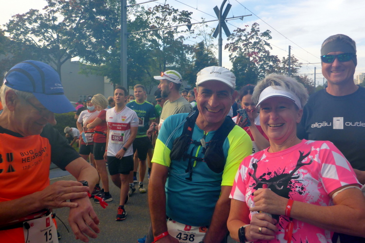 Die Abholung der Startnummer verläuft reibungslos. In einem Flachbau neben der Messe weise ich meine Impfung nach und erhalte ein rotes Einlassband. Damit erhalte ich Zutritt zur Messehalle und bekomme schon nach wenigen Minuten meine Startnummer. Auch wenn es draußen noch etwas frisch ist, ziehe ich es doch vor die Halle zu verlassen, denn dort gilt natürlich die Maskenpflicht. Vor der Halle treffe ich Lauffreunde, die ich schon seit langer Zeit nicht mehr gesehen habe und es gibt natürlich einiges zu erzählen. Schön, es ist wie früher und so verfliegt auch die Zeit und ehe ich mich versehe, stehe ich in der Startaufstellung. Viel zu weit vorne, aber das ist mir erst einmal egal.