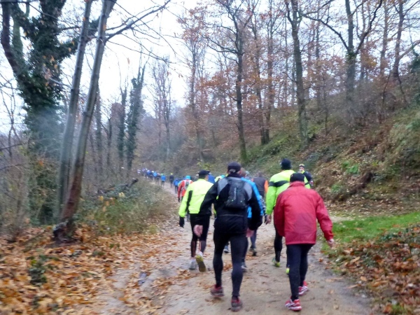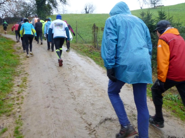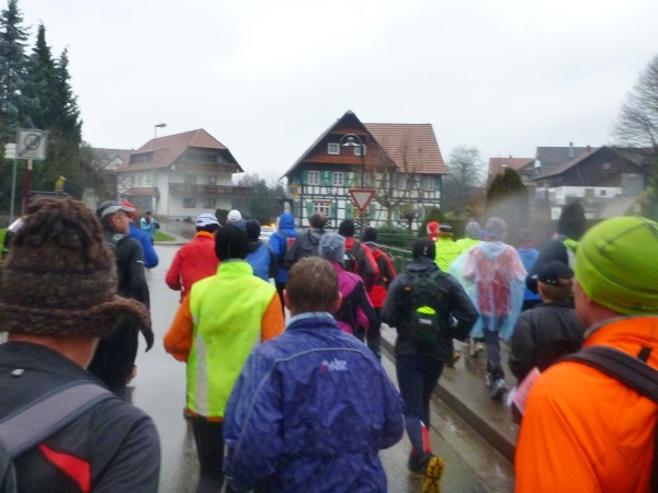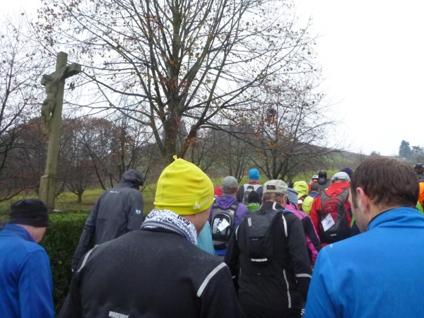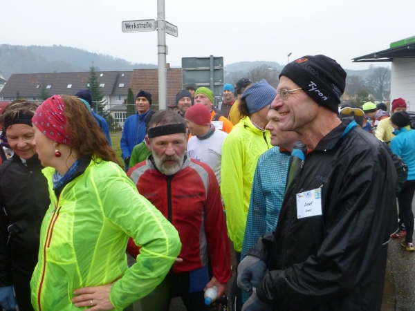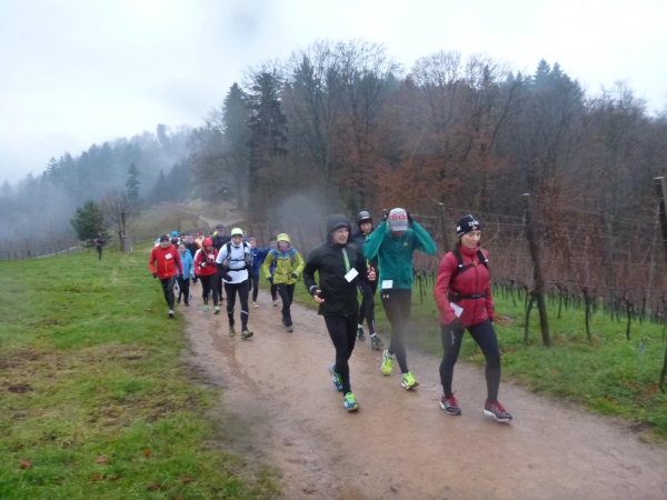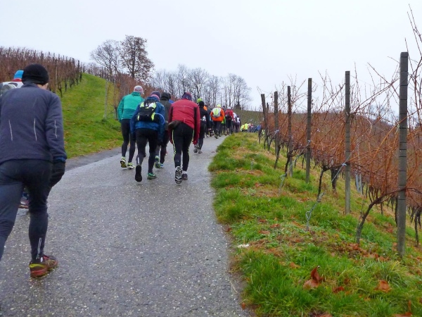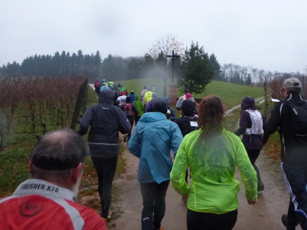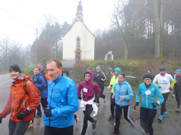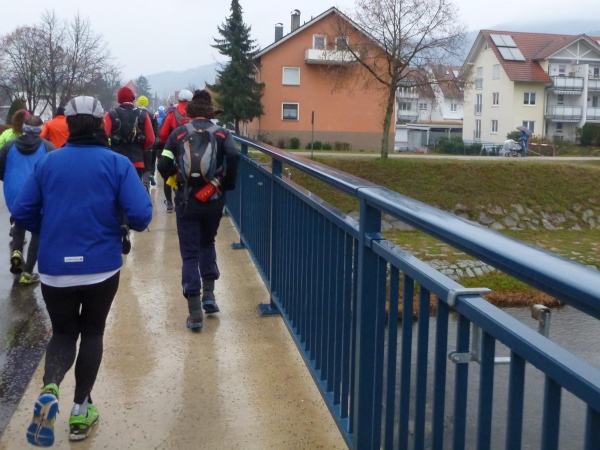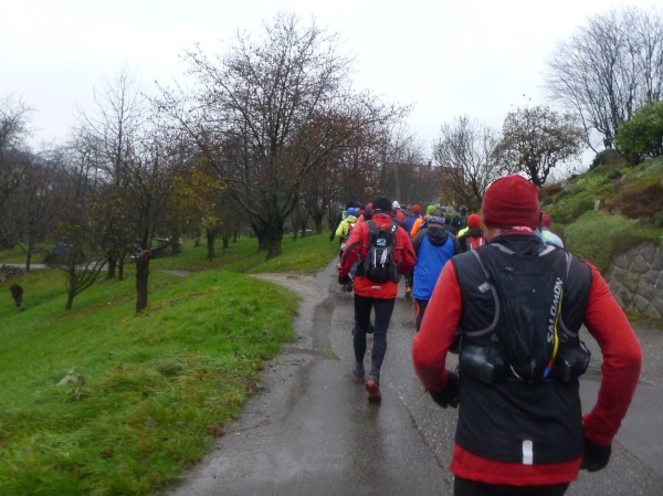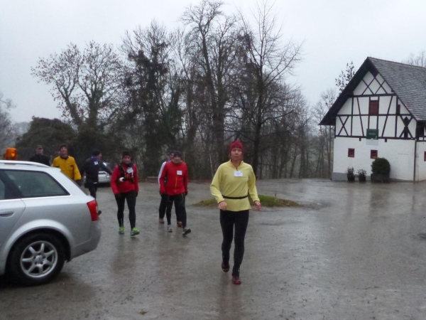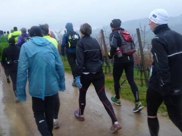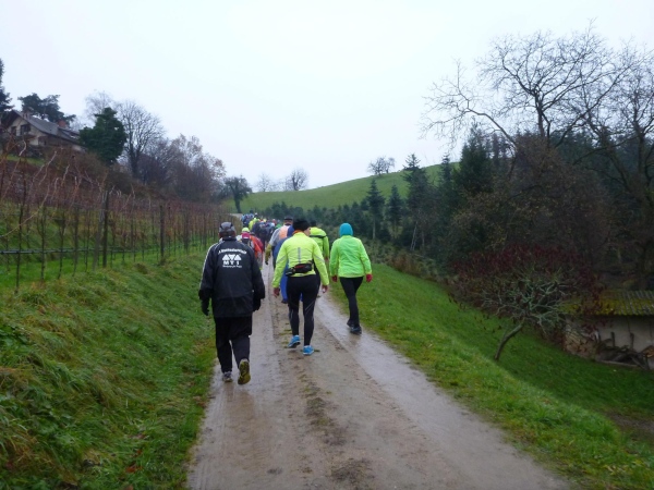 Rolf mahnt zum Aufbruch. Auf dem gleichen Weg, den wir gekommen sind, verlassen wir die gastliche Stätte. In moderatem Tempo geht es weiter. Die meisten Läufer sind in Gespräche vertieft. Nachdem man mit seinen Bekannten die letzten Neuigkeiten ausgetauscht hat, durchmischt sich die Gruppe und man kommt auch mit anderen ins Gespräch. Trotz des miesen Wetters ist die Stimmung gut. Alle sind locker drauf.