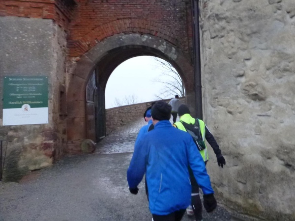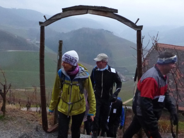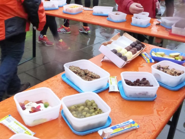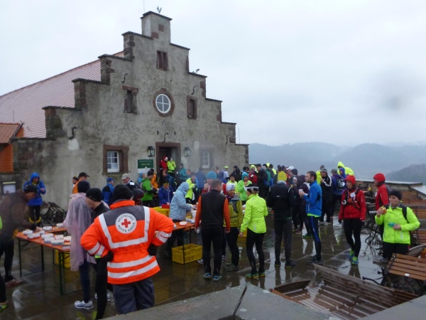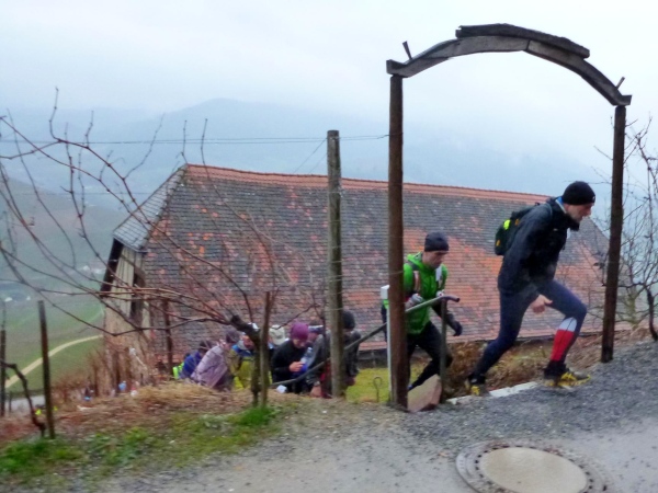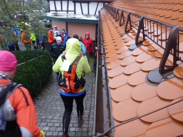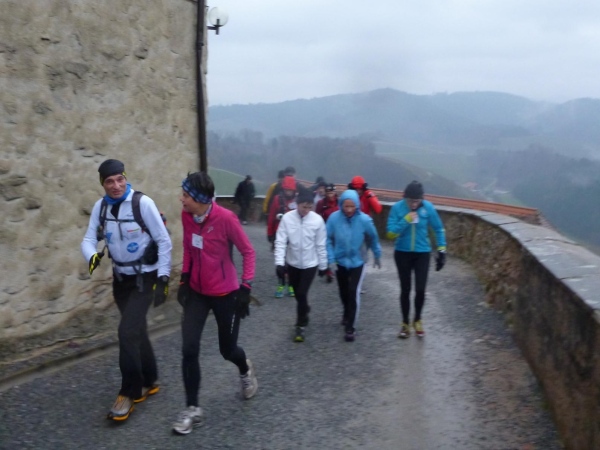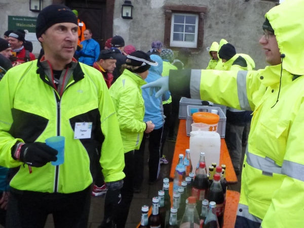 Es geht steil bergauf. Zum Schluss müssen wir noch über eine lange Weinbergtreppe, dann ist das alte Gemäuer erreicht. Die Tore stehen einladend offen. Unser Gepäck ist nach Nummern geordnet bereitgestellt. Schnell hole ich meinen Regenumhang. Norbert ist es zu warm, und er entledigt sich, geschützt im Haus, seines Unterziehshirts. Zur Verpflegung geht es draußen noch eine Treppe höher. Ein eisiger Wind empfängt uns auf der Terrasse des Ausflugslokals. Hier ist ein langes Buffet vorbereitet. Es gibt alle denkbaren Genüsse. Die vielen Läufer scharen sich um die Tische und greifen begeistert zu. Ich habe erst einmal Durst. Es gibt Tee, Wasser und Brühe, den Außentemperaturen angepasst, warm bis heiß, Bier, Malzbier und Cola.