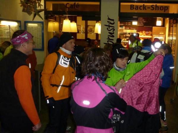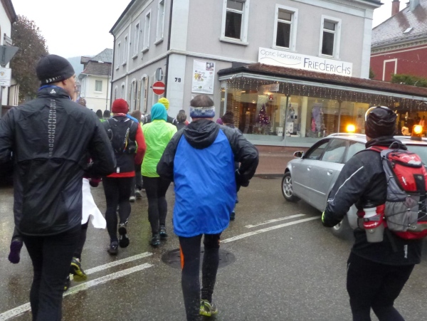 Um Viertel nach 7 treffen wir am Bahnhof von Offenburg ein. Hier ist der Sammelpunkt für über hundert Läufer, die vom Start weg mitlaufen. Im Ziel, in Baden-Baden, werden es mehr als zweihundert sein. Wir erhalten unsere Namensschilder mit den Notfallnummern und ein Coupon fürs Gepäck. Endlich haben wir Zeit, Bekannte zu begrüßen.
