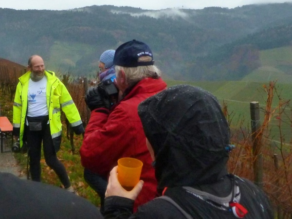 Es ist kurz vor 8 Uhr, als wir draußen auf der Freitreppe Aufstellung für ein Foto nehmen. Noch ignorieren wir die kleinen Tropfen, die vom dunklen Himmel fallen. Es gibt ein Geburtstagsständchen für einen Helfer und eine Ansprache vom Verantwortlichen der Winzergenossenschaft Durbach. Dann verabschiedet uns Rolf, der heute gar nicht selbst mitläuft. Wir machen uns unter der Führung von Brigitte auf den Weg.