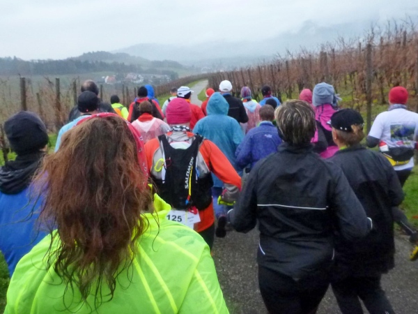 Unsere Strecke führt auf dem Ortenauer Weinpfad entlang. Er verläuft parallel zur badischen Weinstraße - allerdings oberhalb, über die Weinberge hinweg. Zu erkennen ist der Pfad an der roten Raute mit blauer Traube auf weißem Grund. Allerdings stimmt "Pfad" hier nur bedingt. Meistens befinden wir uns auf Straßen oder gut ausgebauten Wegen. Hin und wieder machen Schilder die Wanderer auf die unterschiedlichen Rebsorten aufmerksam. Und natürlich, dem Gelände angepasst, führt der Weg ständig auf und ab. Leider liegt die Landschaft in grauen Nebelschwaden verborgen. Im Wald sind die Wege aufgeweicht. Trotzdem kann man ganz gut laufen. Nur die ganz dicken Matschpfützen werden großzügig umgangen.