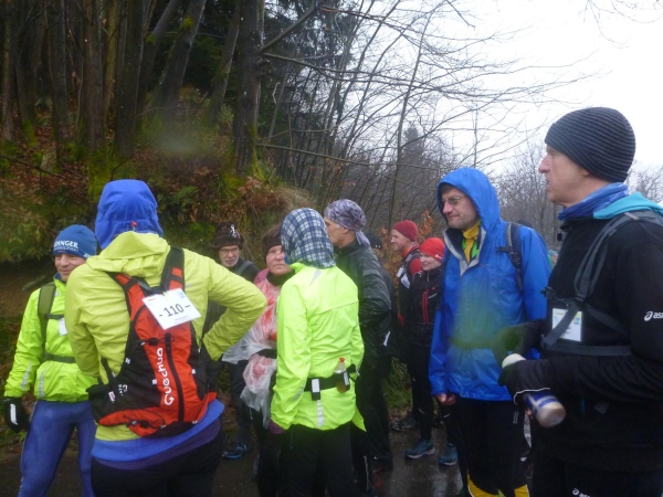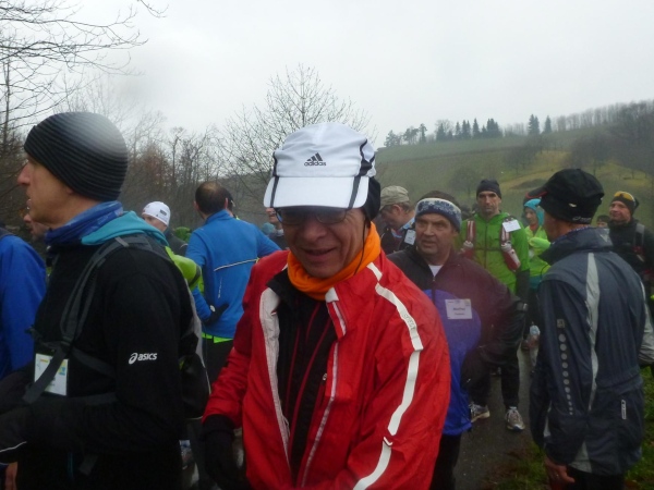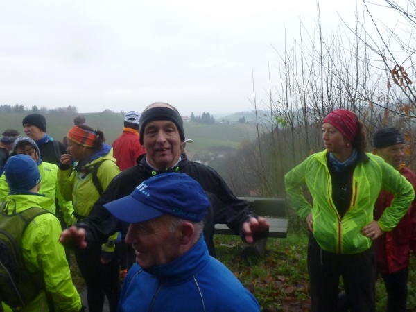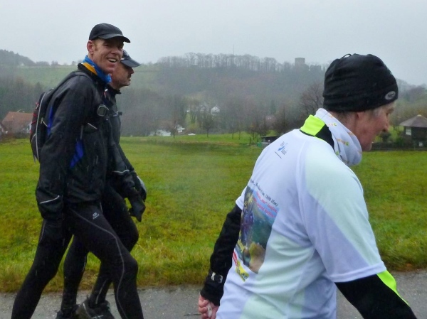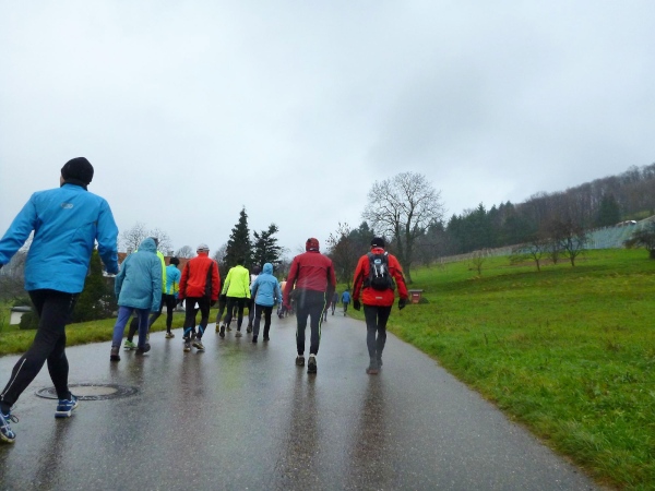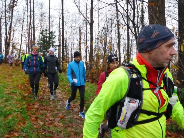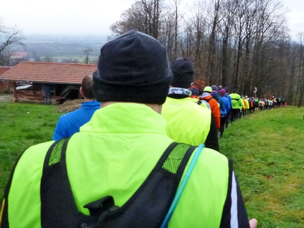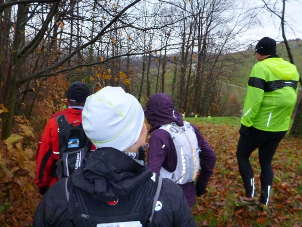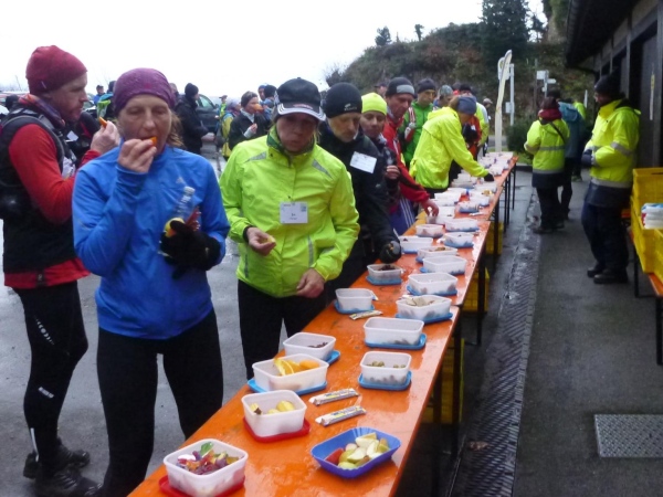 Man merkt, dass nun mehr Läufer dabei sind. Am Verpflegungsbuffet, das wie letztes Jahr hier in einem offenen Carport untergebracht ist, gibt es Stau. Als ich das Essen erreiche, bläst Rolf bereits zum Aufbruch. Am Beginn des folgenden Anstiegs bin ich bei den Letzten. Alle sind immer noch locker unterwegs und nehmen kraftvoll die steile Straße unter die Füße, während ich schon wieder am Kämpfen bin. Erst der matschige Trail bergab hellt meine Stimmung auf. Hier geht es mir besser.