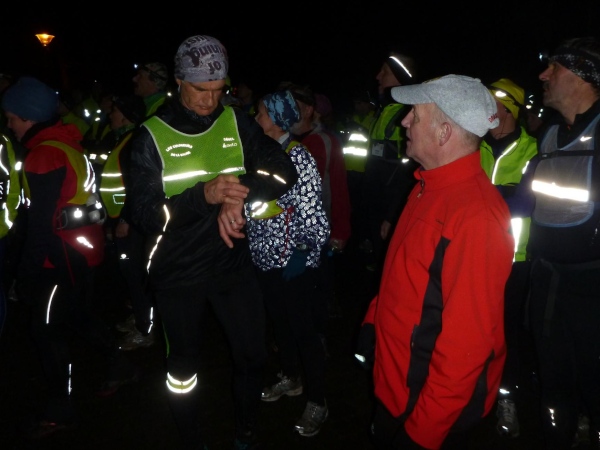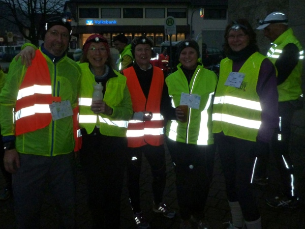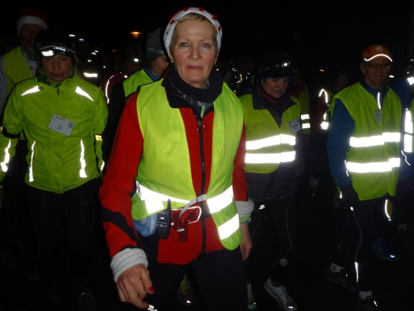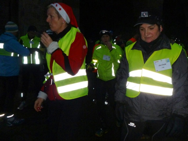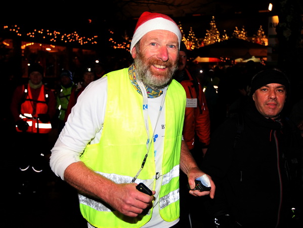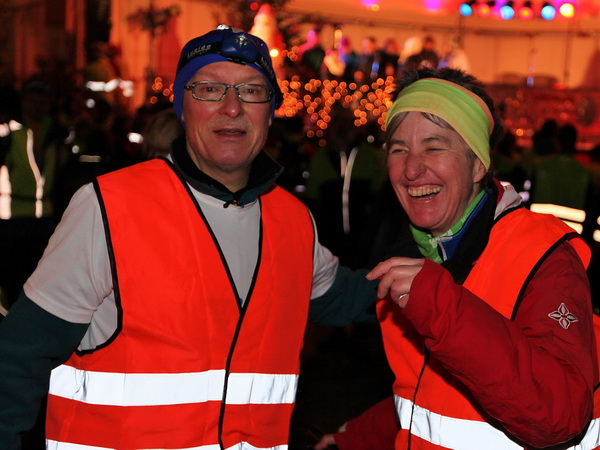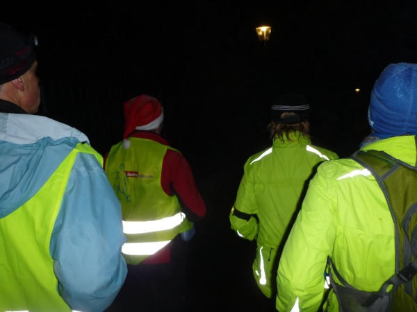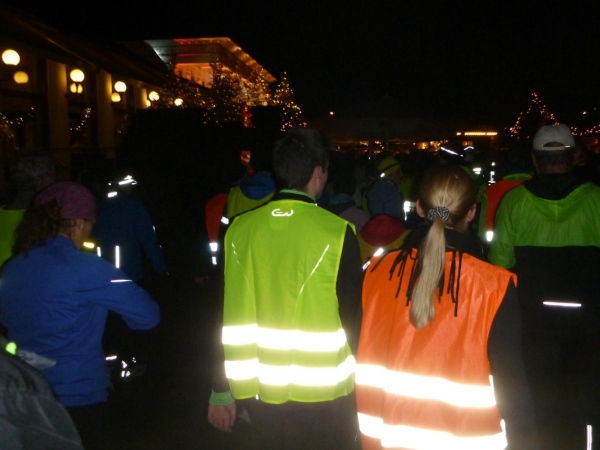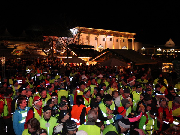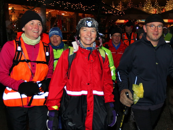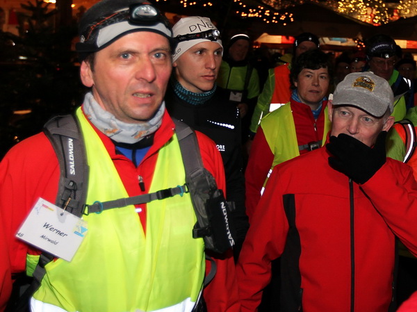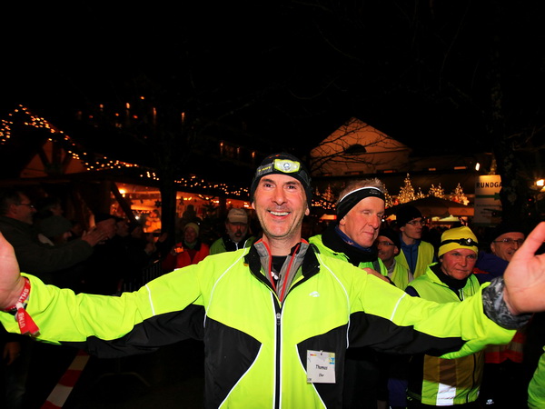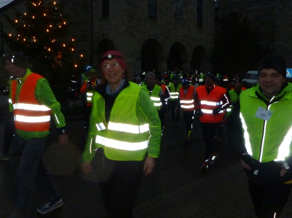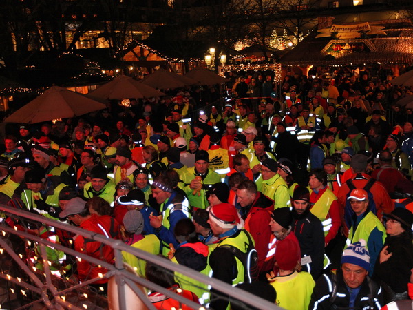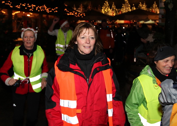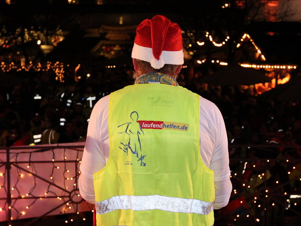 Die letzte Etappe scheint problemlos verlaufen zu sein. Außer einem Sturz, der wohl glimpflich verlaufen ist, gab es keine besonderen Vorkommnisse. Rolf begrüßt die Läufer und gibt letzte Anweisungen. Dann reihen wir uns vorne ein. Ich bin sicherlich nicht die einzige, die diese letzten 2 Kilometer in vollen Zügen genießen kann. Zuerst laufen wir flach die L84 entlang, durch das voraus fahrende Polizeiauto geschützt. Dann geht es für uns rechts einen Fußweg steil den Berg hinunter. Unten sind bereits die Lichter des Weihnachtsmarktes zu sehen. Auch die Walker sind nun da. Der Einzug ins Lichtermeer des romantischen Marktes gleicht einem Triumphzug. Der Weg ist für die Läufer abgesperrt und von begeistertem Publikum flankiert.