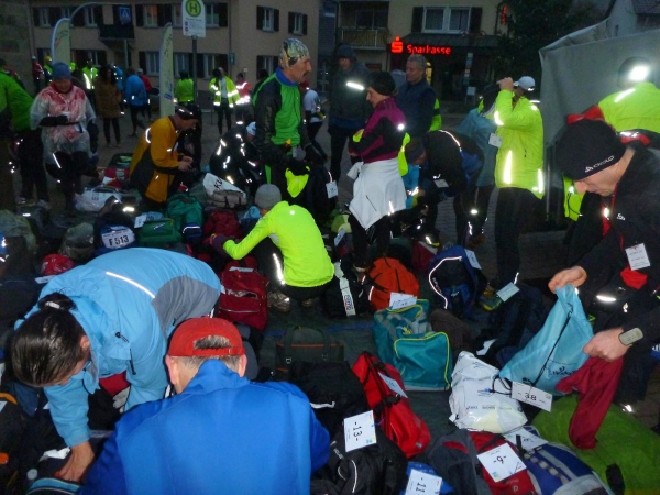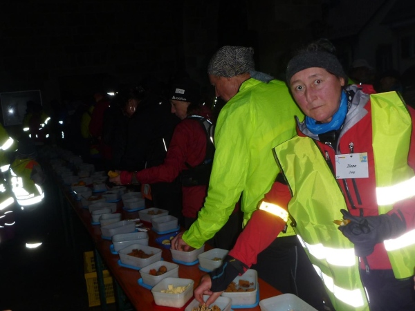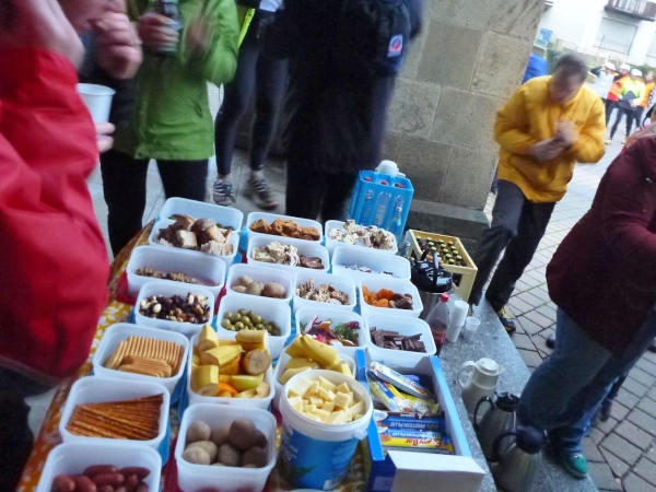 Die Fahrt geht nach Neuweier, wo mitten im Ort an der Kirche die letzte Verpflegungsstation sein wird. Die Helfer sind eingespielt. Während wir uns um das Gepäck kümmern, werden unter den Palisaden im Eingangsbereich der Kirche das Essen und die Getränke aufgebaut. Ich merke, dass es ganz schön schwierig ist, über 200 Taschen nach Nummern zu sortieren. Außerdem müssen hier an der letzten Station alle Läufer ihr Equipment für die kommende Dunkelheit aus dem Rucksack holen. Das muss platzmäßig berücksichtigt werden.