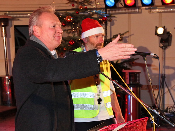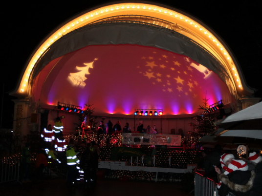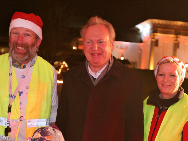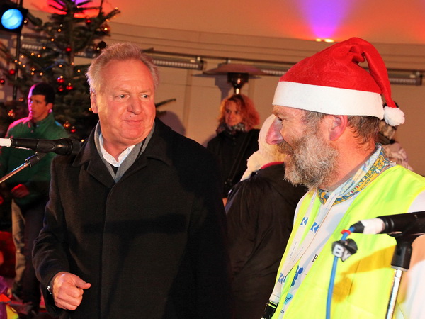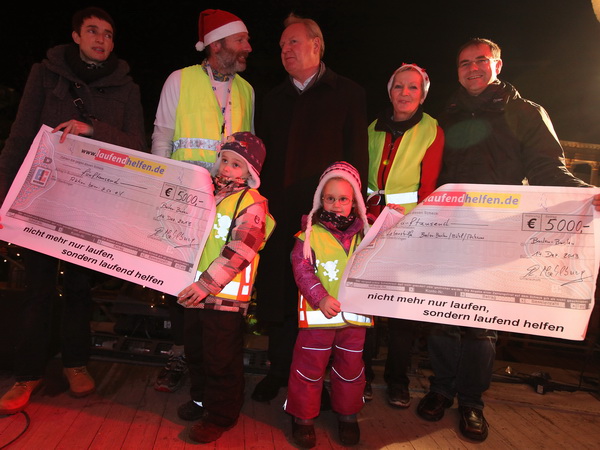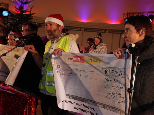 Vor der Bühne in der weihnachtlich illuminierten Konzertmuschel kommen wir zum Stehen. Der Baden-Badens OB Wolfgang Gerstner begrüßt Brigitte und Rolf aufs herzlichste. Während die Läufer mit "Dambedeis" (Hefegebäck) und Glühwein versorgt werden, kann Rolf die Spendenschecks übergeben. Insgesamt wurden 10 000 Euro erlaufen, die zu gleichen Teilen der Lebenshilfe Baden-Baden/Bühl/Achern sowie der Aktion Benni & Co zugutekommen.