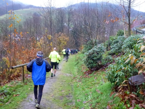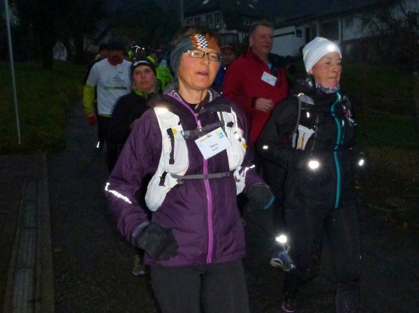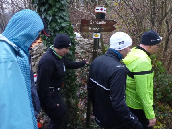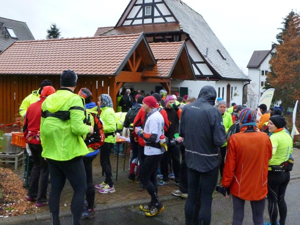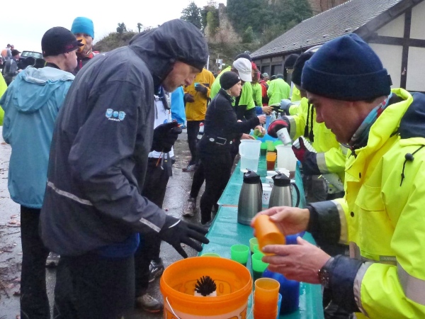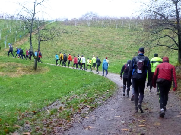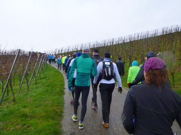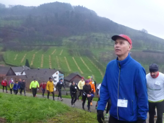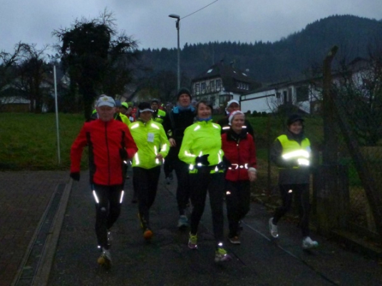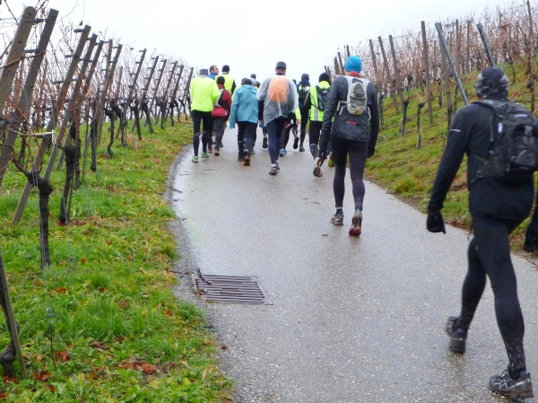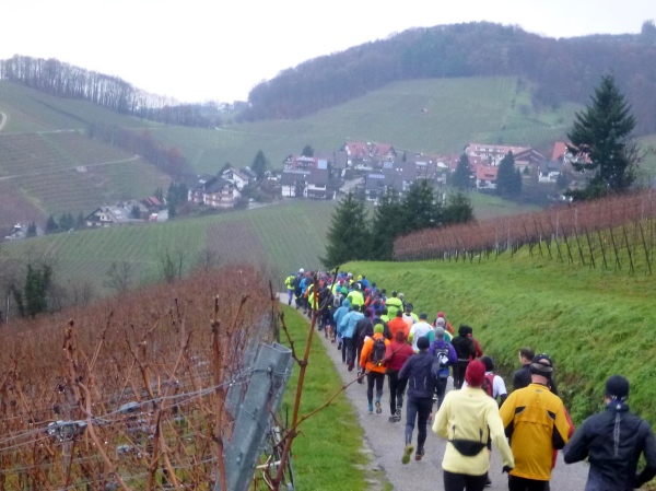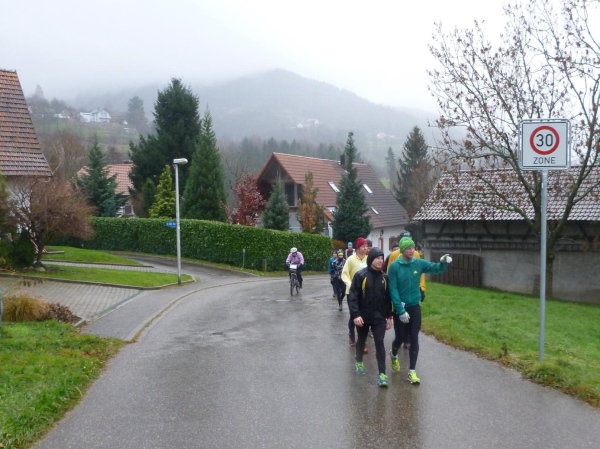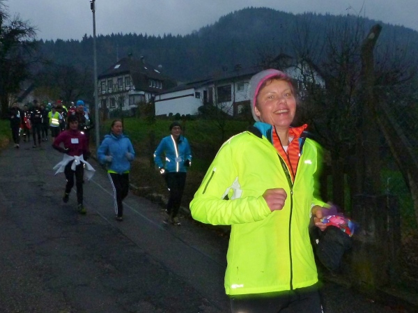 Ich versuche vorne dran zu bleiben. Obwohl Brigitte immer zum langsamen Laufen mahnt, kann ich an den Anstiegen nicht folgen. Bergab muss ich nun ganz schön rennen. Ich bin froh, als wir auf den mir bekannten Singletrail einbiegen, wo am Ende eines langen steilen Gefälles Sasbachwalden mit der nächsten Verpflegung auf uns wartet. Die Hälfte ist geschafft und es gibt zum ersten Mal zusätzlich Glühwein.