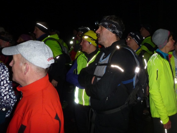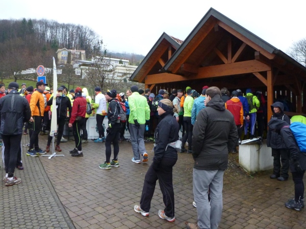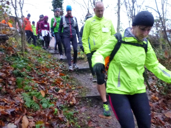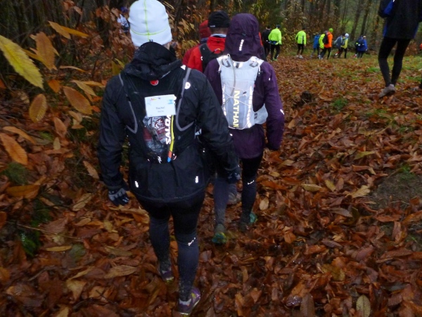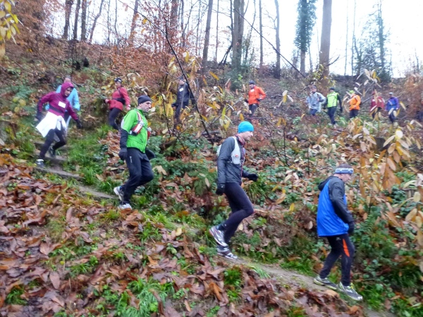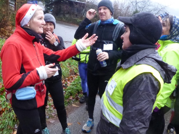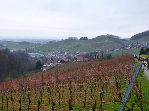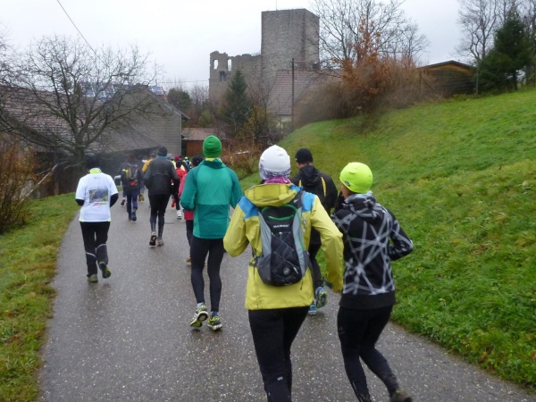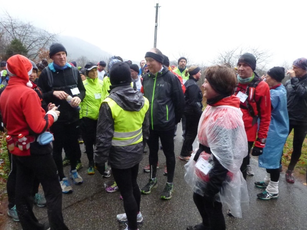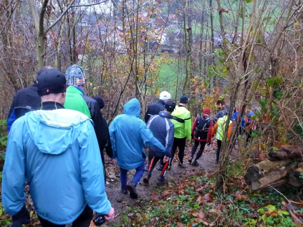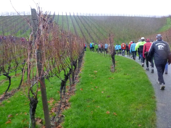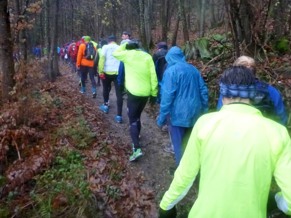 Ich versuche vorne dran zu bleiben. Obwohl Brigitte immer zum langsamen Laufen mahnt, kann ich an den Anstiegen nicht folgen. Bergab muss ich nun ganz schön rennen. Ich bin froh, als wir auf den mir bekannten Singletrail einbiegen, wo am Ende eines langen steilen Gefälles Sasbachwalden mit der nächsten Verpflegung auf uns wartet. Die Hälfte ist geschafft und es gibt zum ersten Mal zusätzlich Glühwein.