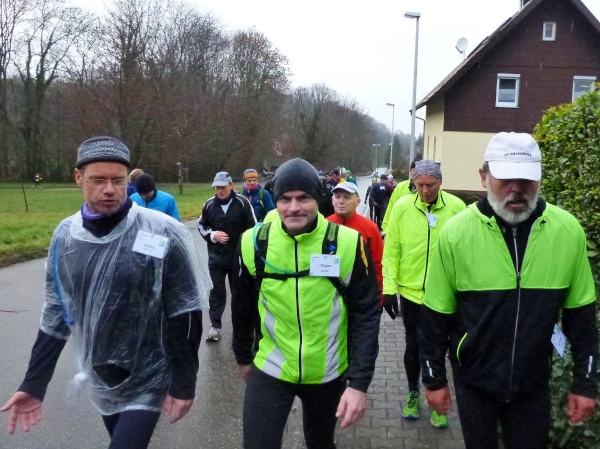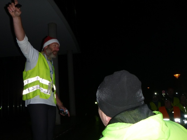 Rolf will mit mir den Läufern entgegengehen. Auf dem Parkplatz beim SWR erwartet uns die Polizei mit 2 Fahrzeugen. Als Sicherung der Läufer auf den letzten 2 Kilometer in die Innenstadt sind sie unerlässlich. Gerade treffen die Walker ein. Perfektes Timing. In diesem Tempo werden sie kurz vor den Läufern den Weihnachtsmarkt erreichen. Wir sind gespannt, wann Brigitte mit ihrem Gefolge eintreffen wird.