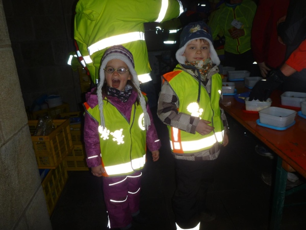 Für uns heißt es nun warten. Ein paar Neueinsteiger melden sich bei Rolf und erhalten ihre Namensschilder und eine kurze Einweisung. Dann kommt das Führungsfahrzeug. Ein paar Minuten später gleicht der große Kirchenvorplatz einem Heuschreckenschwarm. Wie vorhergesehen werden die Taschen geplündert. Bald dominieren gelbe und orangefarbene Leuchtwesten das Bild. Die Verpflegung ist heiß begehrt. An der langen Tafel haben gar nicht alle Platz.