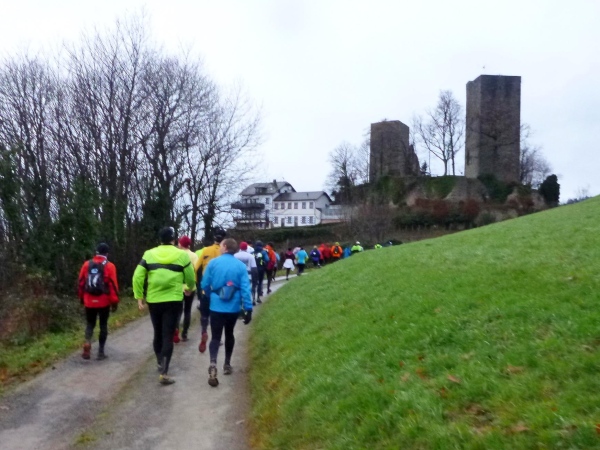 Irgendwo im Wald ist dann die Marathondistanz geschafft. Die sonst übliche La-Ola-Welle fällt aus. Dann erreichen wir wieder nach steilem Anstieg die Burg Windeck. Ich melde mich bei Norbert und Brigitte ab und bitte Rolf, mich im Auto mitzunehmen.