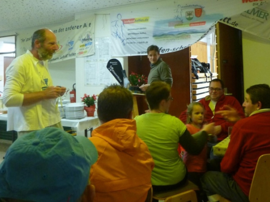 Die lange Tafel ist hier etwas geschützt unterhalb der Ruine der imposanten Burganlage der Herren von Windeck aufgebaut. So geht die Verpflegung der vielen Läufer geordnet vor sich. Die Gruppe bricht auf. Nach kurzem Aufatmen der Helfer ist der Abbau in vollem Gange. Rolf hat an seinem Pkw den Anhänger für das Gepäck der Läufer. Zwei weitere Helfer sind gerade dabei, die Taschen einzusammeln. Fachmännisch verstaut Rolf die Taschen. In der Zwischenzeit haben die anderen Helfer in Windeseile die Verpflegungstische zusammengepackt und verladen.