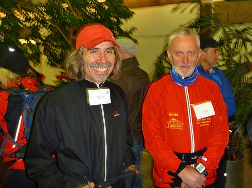In Offenburg am Bahnhof geht es um 8 Uhr los. Kein Wetter für Hunde und so drücken wir uns in der Bahnhofshalle rum, bis wir von der hohen Politik Offenburgs mit einem Gedicht auf die Strecke geschickt werden: „Es gibt nichts Gutes, man kennt es - außer man rennt es.“ So oder so ähnlich. Das Gepäck kommt auf den Anhänger und wird zu den 5 Verpflegungsstationen gebracht. Isotonische Getränke habe ich nicht in meinem Gepäck, die gibt es zu Genüge an den VP´s.