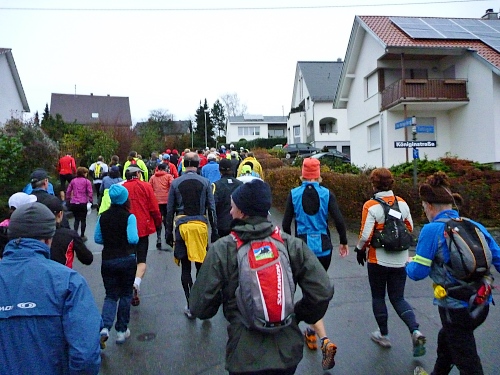Dann geht es los. Wir kämpfen uns aus Offenburg hinaus in die Weinberge. Nur rote Ampeln halten uns auf. Alfons fährt mit blickendem Auto vor und sichert uns bei Strassenüberquerungen. Eddi faucht wie ein Gänsevater, wenn man seinem blinden Schützling, dem Horst zu nahe kommt. Doch bald sind wir sortiert. Ich laufe am Ende des Feldes um niemanden zu behindern, wenn ich ein Fotomotiv entdecke, doch im Dämmerlicht muss man lange stillhalten. Brigitte ist die Leitkuh, niemand darf sie überholen, außer der m4y-Reporter. Rudolf wieselt durch das Läuferfeld, schaut, dass alles reibungslos läuft. 110 Spinner zusammenzuhalten ist eine große Aufgabe, aber wir sind gerne diszipliniert.