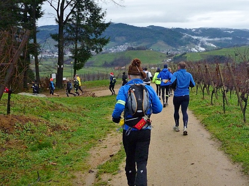Wunderschöne Gegend hier, oft bleibe ich zurück, um die schneebedeckten Berge oder die vielen Sühnekreuze am Wegrand zu fotografieren, dann muss ich schnell aufholen um an der Truppe dranzubleiben. Da die Läufer eng zusammen laufen, gibt es eigentlich immer ein schönes Motiv mit den bunten Klamotten in der Dezembernatur. Wir erreichen den Weinort Oberkirch. Ich liebe diese Weinberge mit den alten Steinen, Häusern und Wegen, habe auch genügend Zeit zum Fotografieren. Verzeiht, es sind viele Fotos, aber wir wurden so schnell Laufkumpels.
