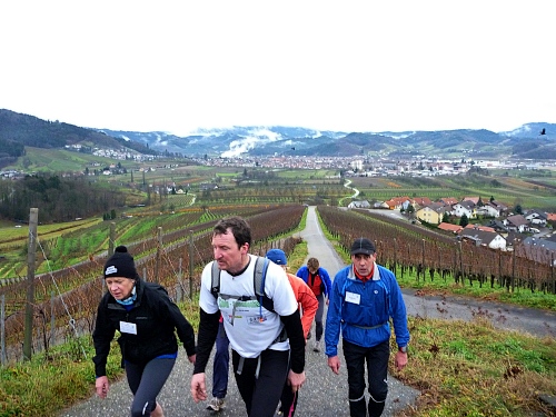 Der Lauf heißt Eisweinlauf, weil er durch die Rebenlandschaft der Ortenau von Offenburg nach Baden-Baden geht. Die Ortenau ist das Weinanbaugebiet am rechten Oberrhein, am Fuße des Schwarzwaldes. Steile Westhänge und hüglige Wein-und Obstplantagen werden uns auf 65 km mit 1800 Hm beglücken. Eiswein gibt es nicht, sonst bliebe keine Kohle vom Spendenlauf für die Kinder übrig. Der diesjährige Eiswein hängt noch an den Reben des Ortenauer Weinpfades.