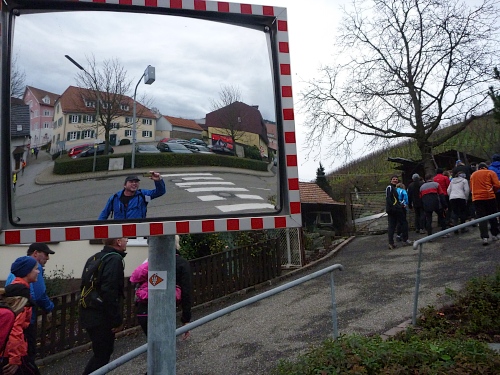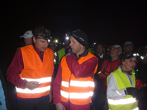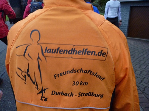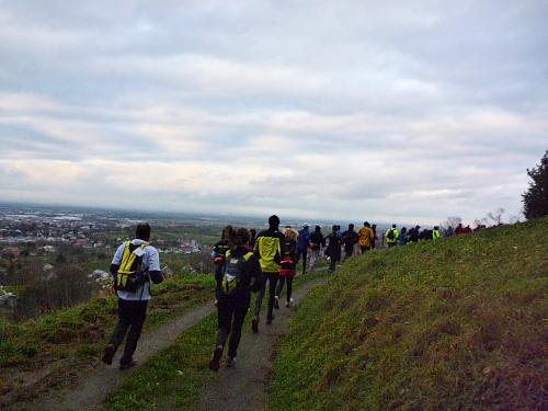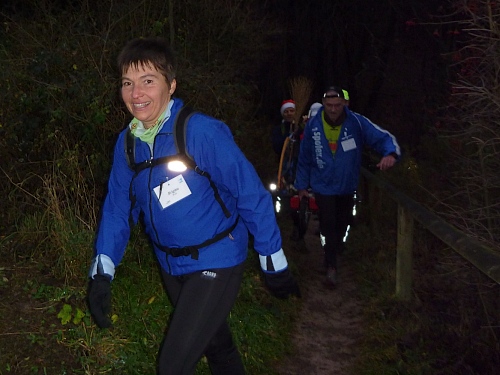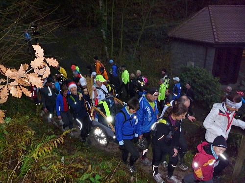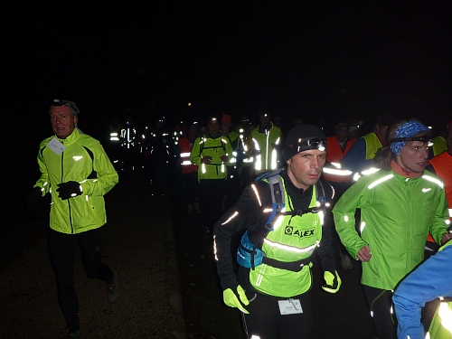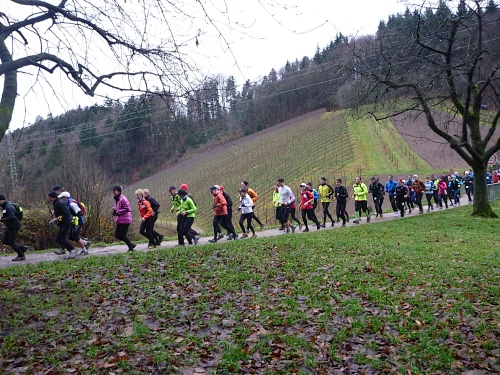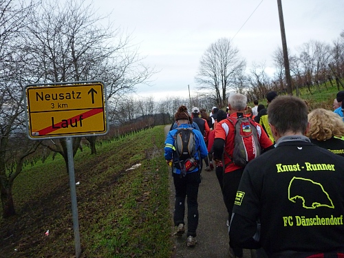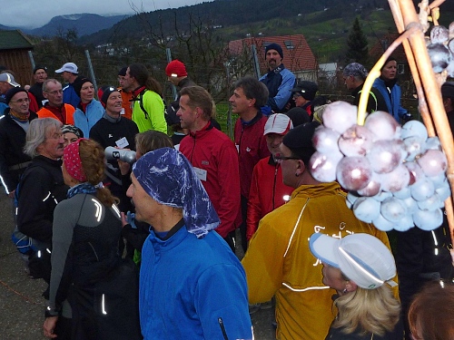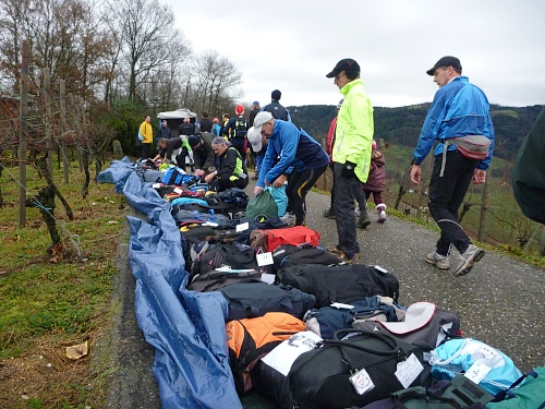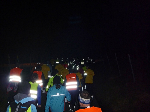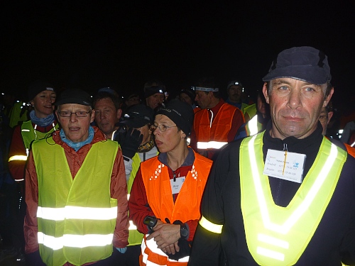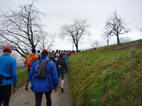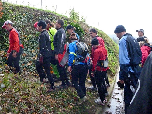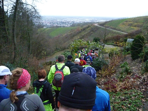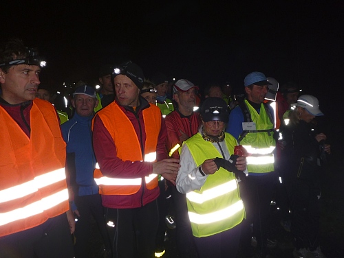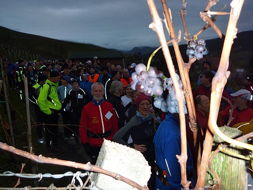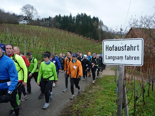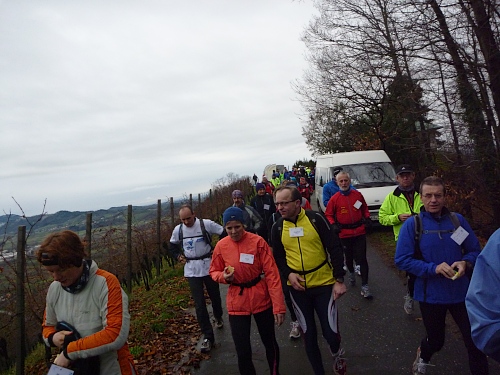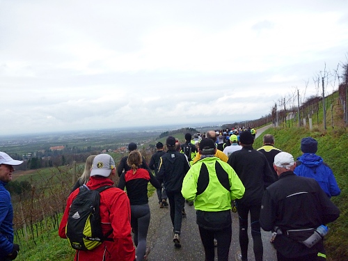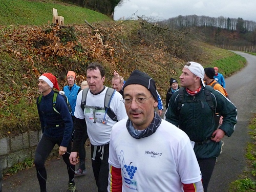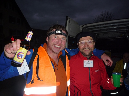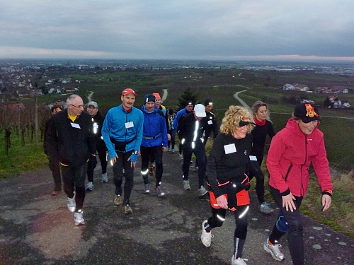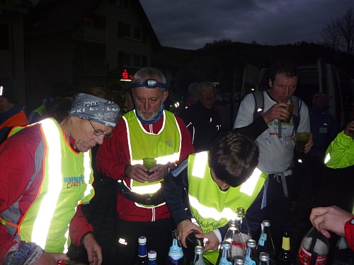 Dann der letzte VP in Neuweier an der Kirche. Umziehen, es wird kalt. Pflicht ist es ab jetzt, eine Signalweste und Stirnlampe zu tragen. Ich muss essen, trinken und den Akku der Kamera wechseln, nebenbei Fotos schiessen. Und schon ziehen wir weiter wie ein Demonstrationstrupp von Müllmännern.