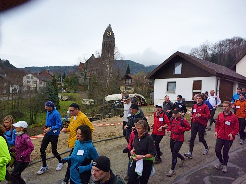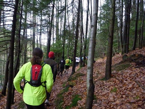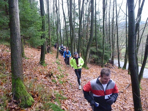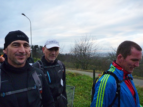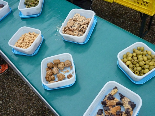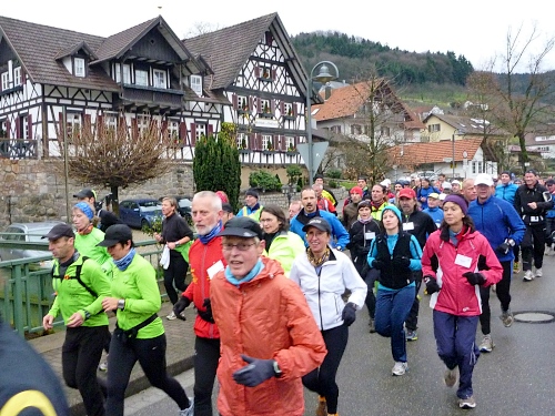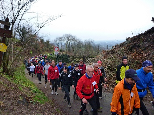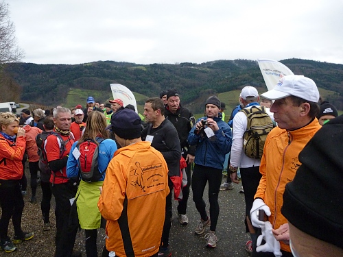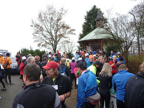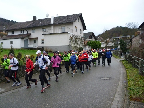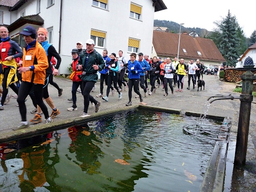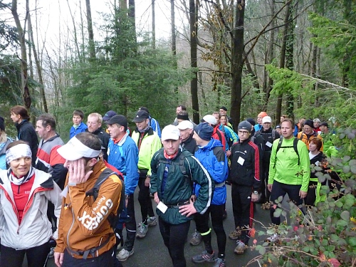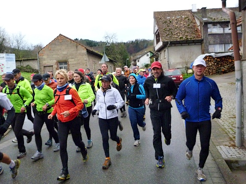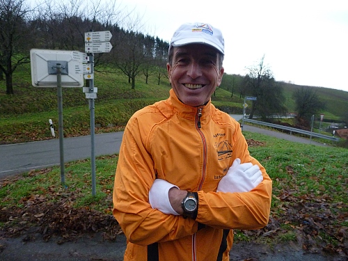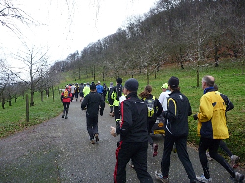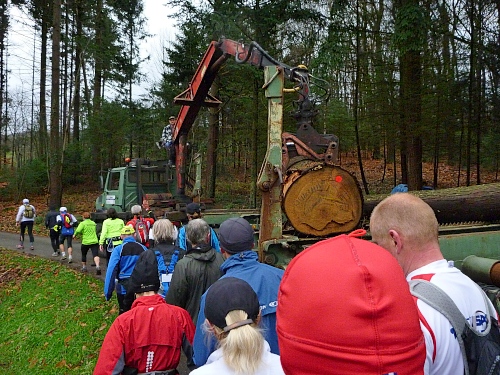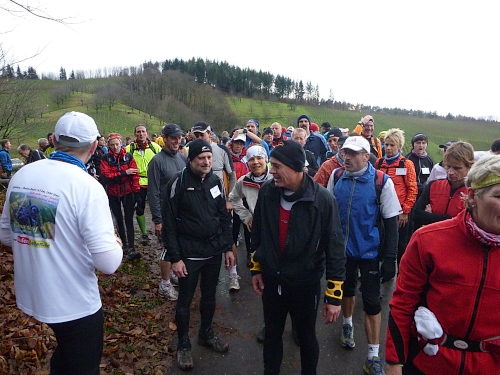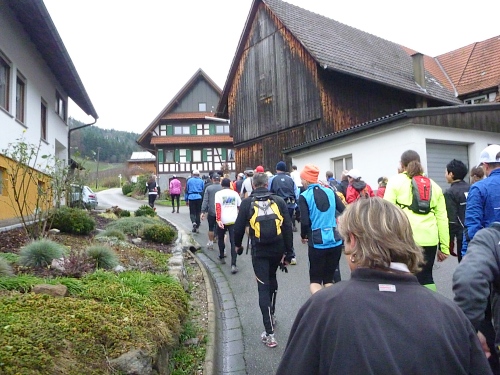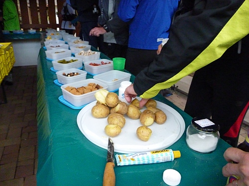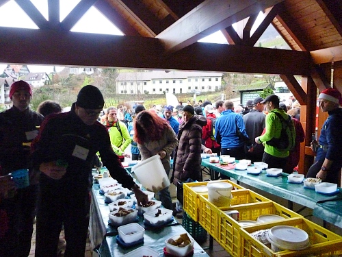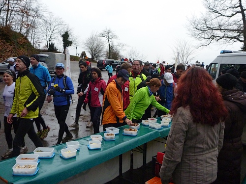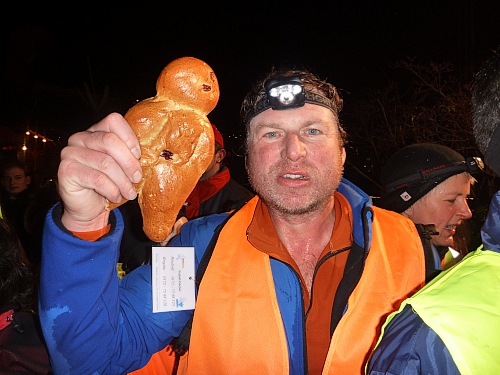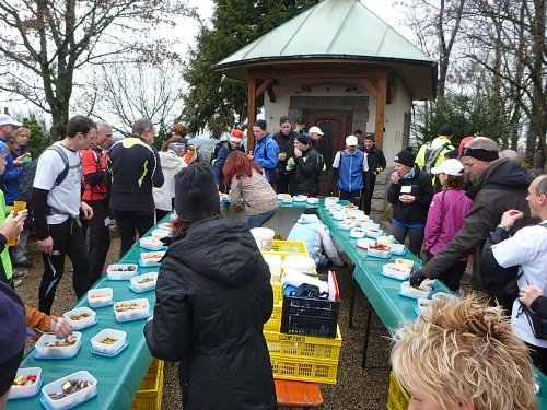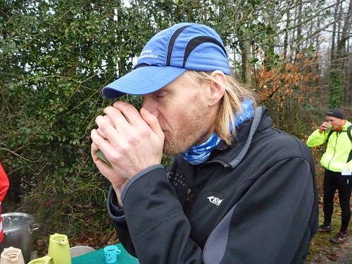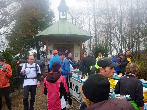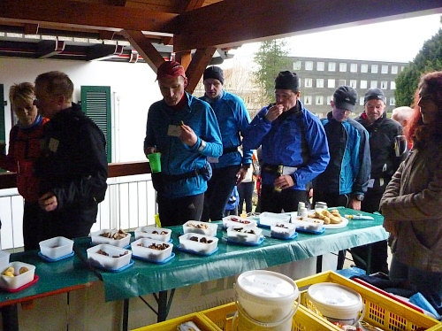 Wieder 8 Minuten Zeit, um sich zu verpflegen. Nicht dass der Eindruck von Hektik beim Leser entsteht. Dies ist ein ganz gemühtlicher, ruhiger Lauf, doch ich hatte die gesamte letzte Woche überhaupt nichts gegessen und nun gibts hier diese sagenhafte Auswahl! Da ich zusammen mit drei Brüdern aufgewachsen bin, habe ich mir als der jüngste eine effektive Esstechnik angeeignet. So mische ich Frikadellen mit Honigkuchen und Oliven. Noch nie habe ich so viele Oliven gegessen, Käsestückchen drüber, Gummibärchen und das ganze nochmal, im Kreis drumrum laufen. Getränke und Fotoaparat in der anderen Hand, mit ner sauren Gurke auf Haselnussecke, der Rede vom örtlichen Bürgermeister lauschen, während Michael sich Cola in den Trinkrucksack kippt. Vor den zwei Pfiffen vom Sklaventreiber greife ich mir noch ne Handvoll Christstollen und ein paar Nüsse und Trockenobst, dann gehts weiter.