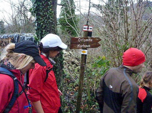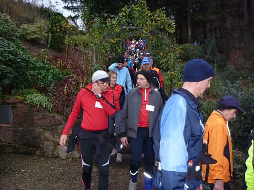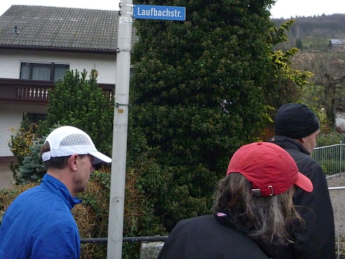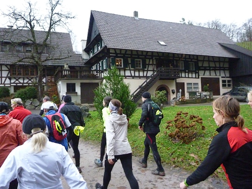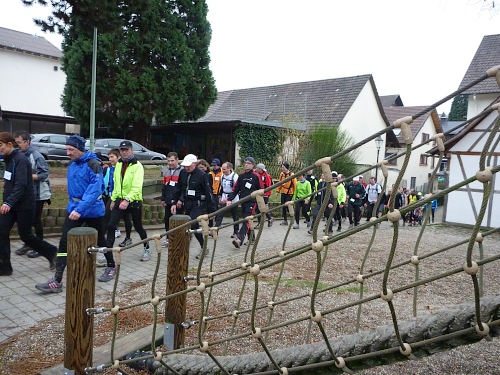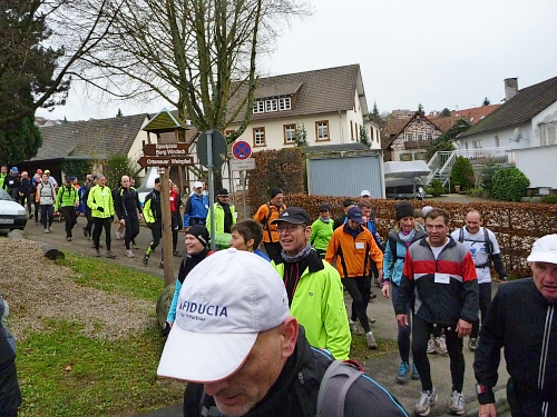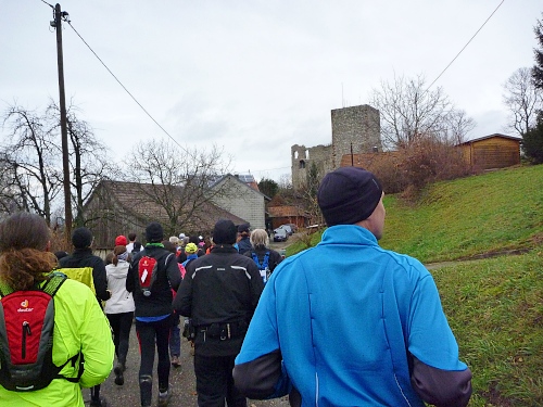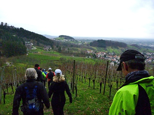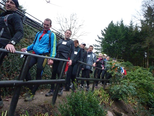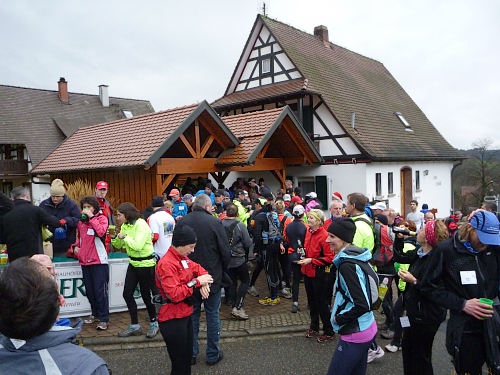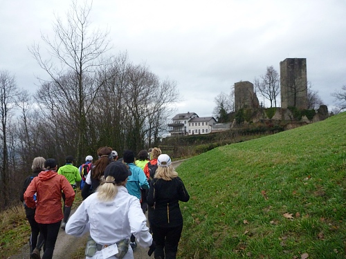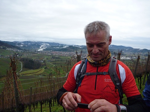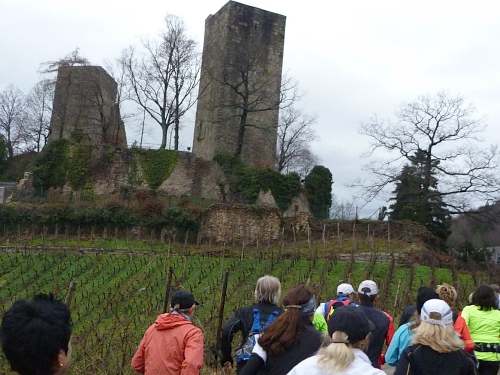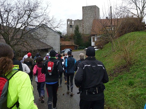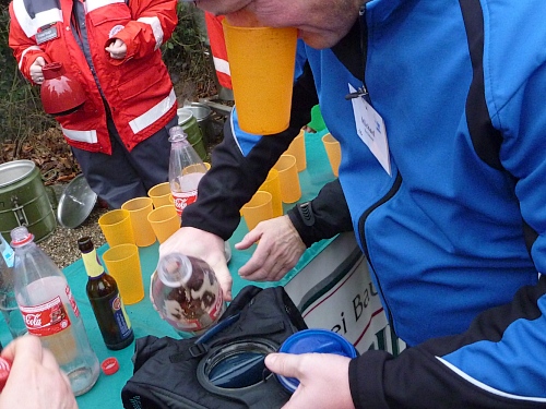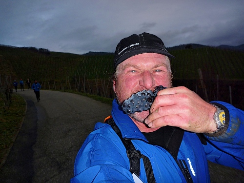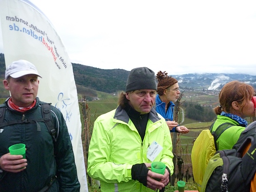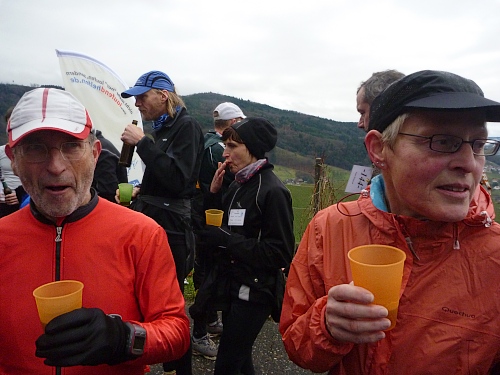 Passenderweise laufen wir durch Lauf. Die Stimmung wird immer besser, immer mehr wird gelacht, Zeit für einen Glühwein! Den gibt es auf der Burg Alt-Windeck, unserem nächsten VP. Die Burg wurde nie durch Krieg zerstört, nur ein Feuer im 14. Jahrhundert machte die Burg unbewohnbar. Die Herren von Windeck residierten fortan im Schlosshof von Bühl, heute der „Badische Hof“. Wieder irgendein Offizieller, der uns begrüßt. Ich frage mich, ob Rolf Zeit hat für die Köstlichkeiten, die er uns hier kredenzt. Klamotten werden gewechselt, Lauf-BH´s blitzen, schlammige Füße werden abgeklebt. Du siehst auch andere leiden unter den Kilometern, doch Gemeinsamkeit macht stark. Und ich wundere mich über den reissenden Absatz des Glühweins, versuche Michael beim Austausch von Glühwein gegen Cola in seinem Trinkrucksack zu fotografieren.