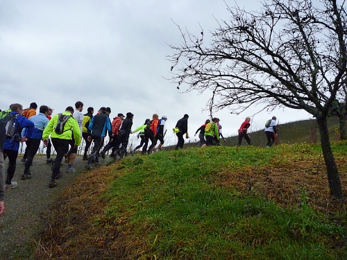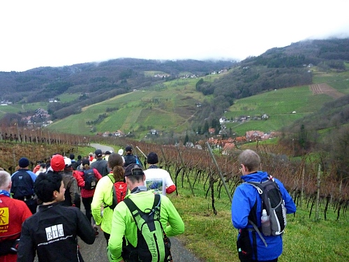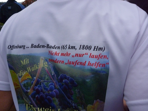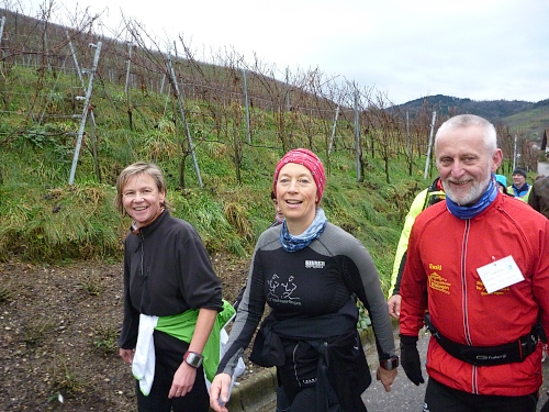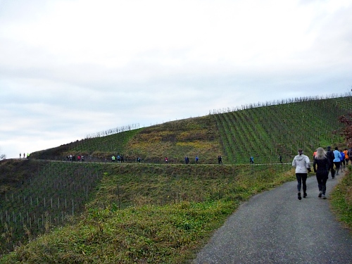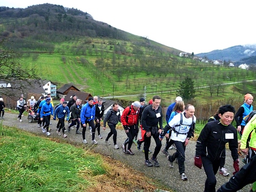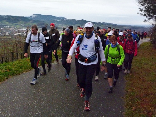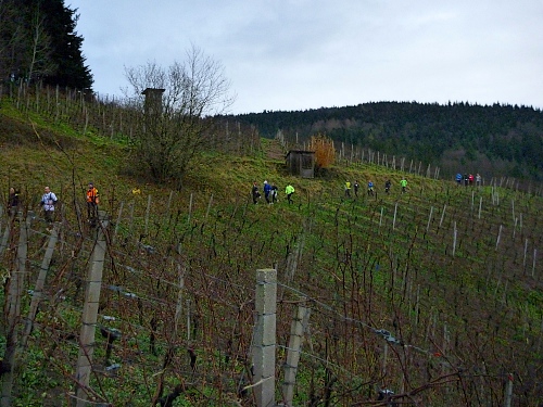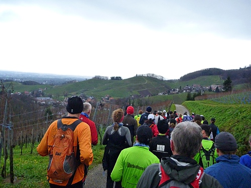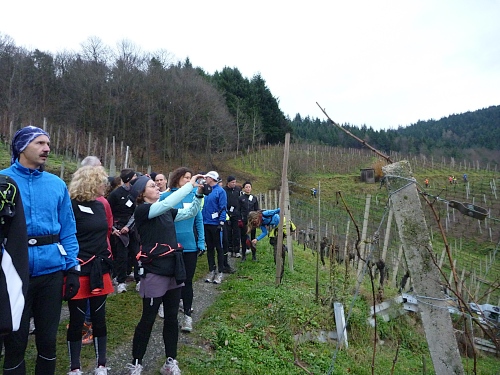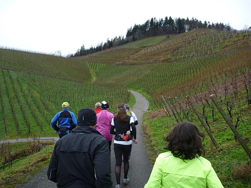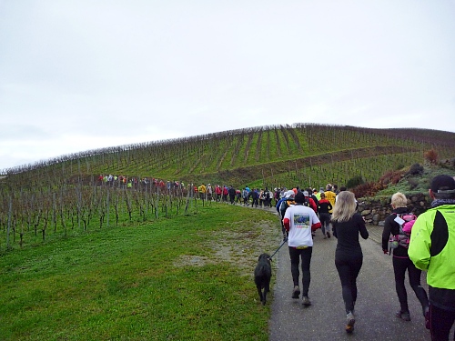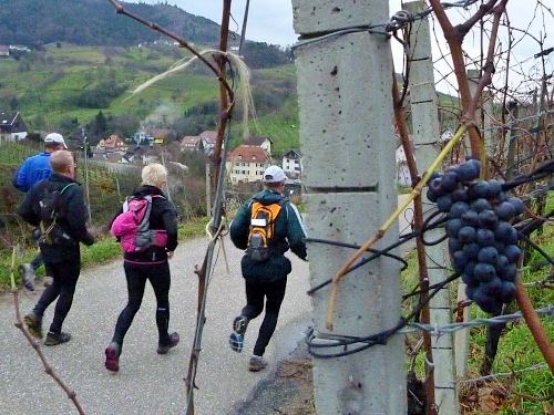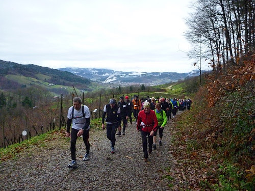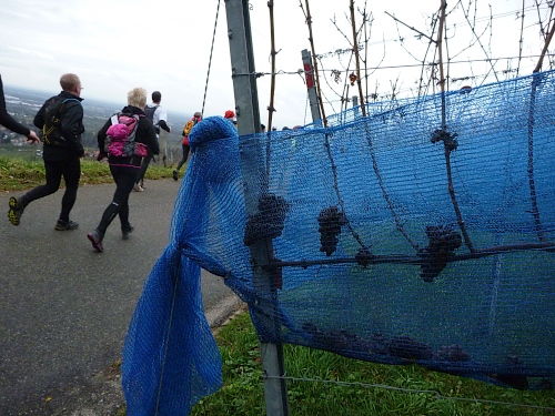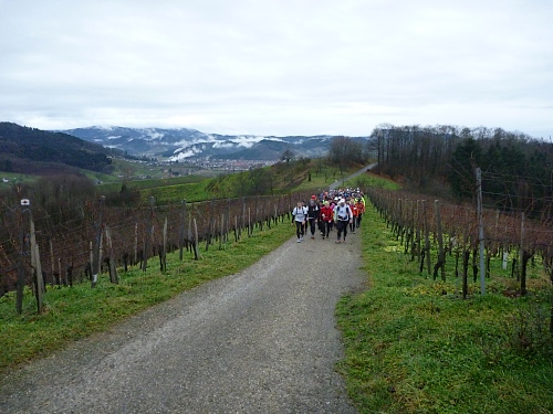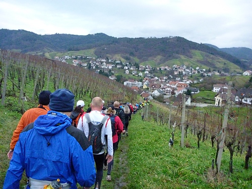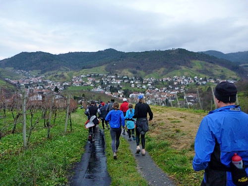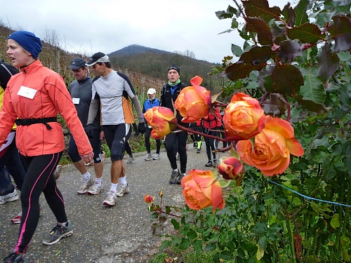 Auf der anderen Seite geht es hinauf nach Sasbachwalden mit seinen 40 verlockenden gastronomischen Betrieben, von der Winzerstube bis zum Michelin-Restaurant. Berühmt ist das Weingut Alde Gott und Vierthaler sowie das Klostergut Schelzberg. Trailartige Abschnitte. Das Laufen in der Gruppe macht immer mehr Spass, man kennt sich nun seit Stunden, es gibt viele Fotos. Wir haben keinen Wettkampf, wir haben eine Party für den guten Zweck und es wird immer lustiger in der Laufgemeinde.