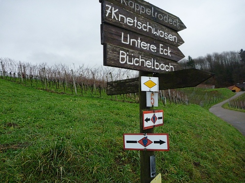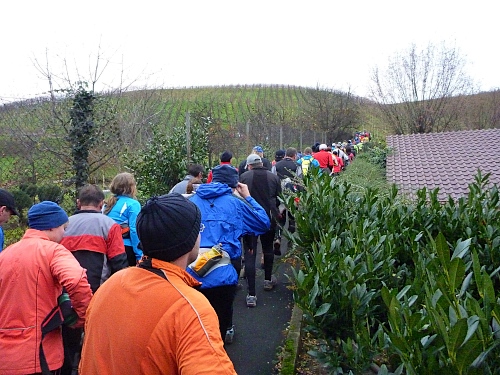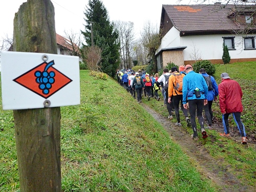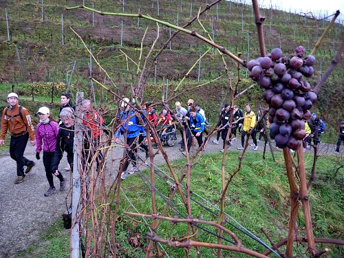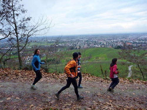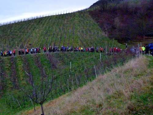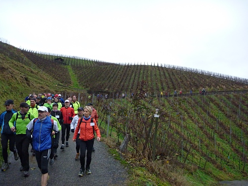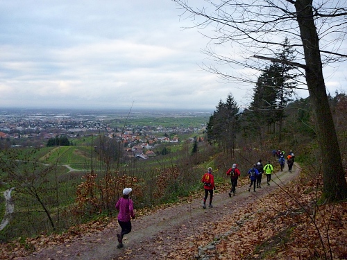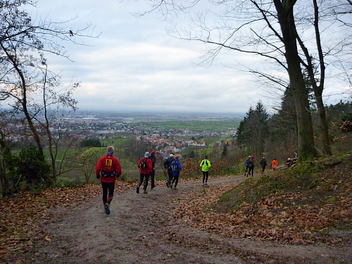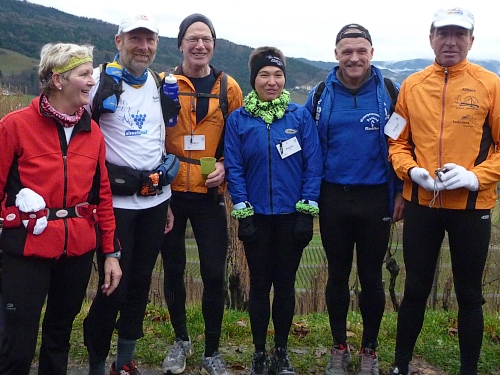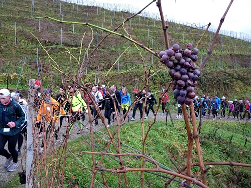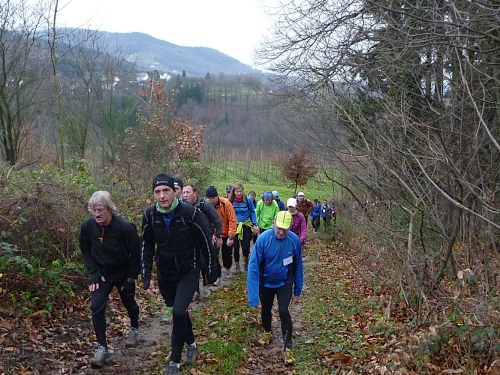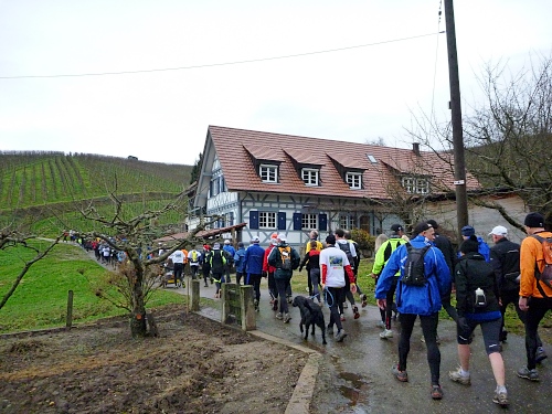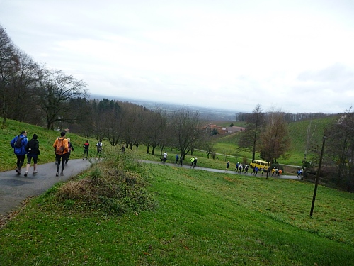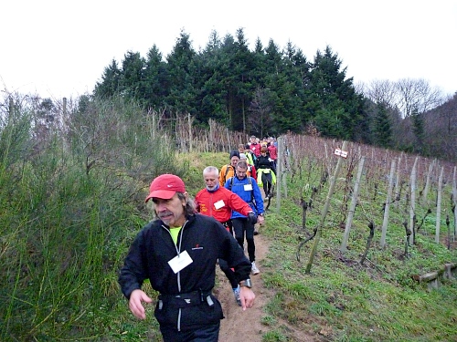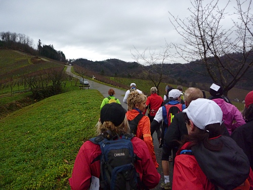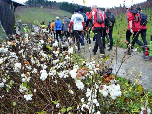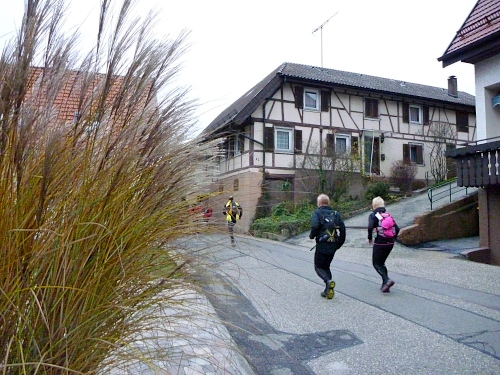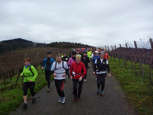 Auf der anderen Seite geht es hinauf nach Sasbachwalden mit seinen 40 verlockenden gastronomischen Betrieben, von der Winzerstube bis zum Michelin-Restaurant. Berühmt ist das Weingut Alde Gott und Vierthaler sowie das Klostergut Schelzberg. Trailartige Abschnitte. Das Laufen in der Gruppe macht immer mehr Spass, man kennt sich nun seit Stunden, es gibt viele Fotos. Wir haben keinen Wettkampf, wir haben eine Party für den guten Zweck und es wird immer lustiger in der Laufgemeinde.