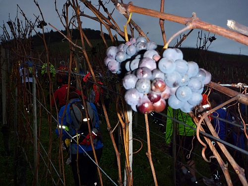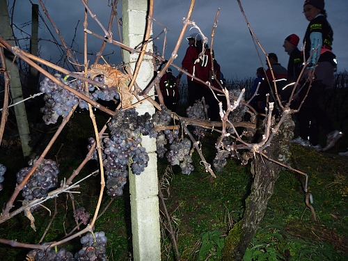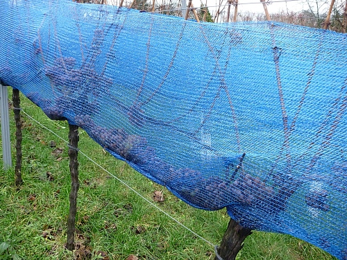 Und dann in den blauen Netzen der Eiswein! Schimmlig, pilzig und schrumplig warten dort die Trauben auf den ersten Frost. Sieht aus, wie im Gemüsefach meines Kühlschranks.