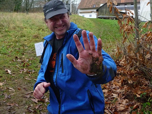Die hohe Flüssigkeitsaufnahme bedingt mehrere Boxenstopps. Rolf zeigt auf geheime Orte, ich hechte dorthin, der Leser will ja informiert sein. Es sind feminine Orte an denen weisse Hintern blitzen. Also nicht laufrelevant, die Linse war eh beschlagen. Auch blaue Beeren blitzen in der Dämmerung, willkommene Zusatznahrung. Es ist eine Riesen Gaudi, wir stopfen uns voll damit.