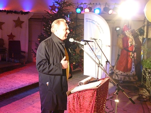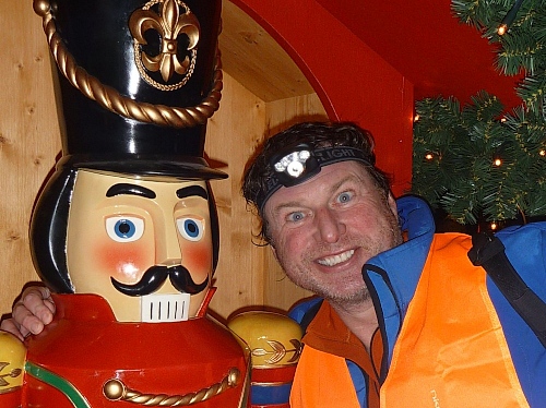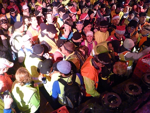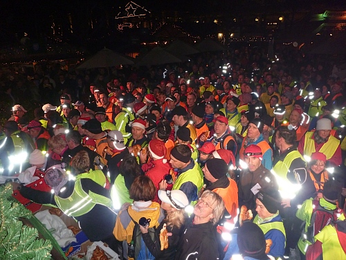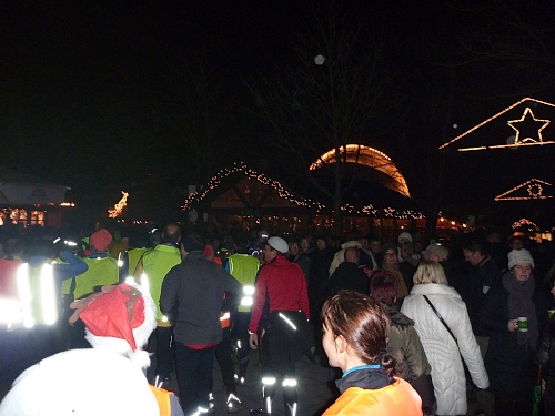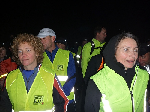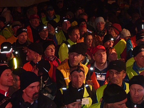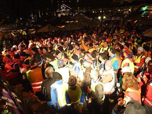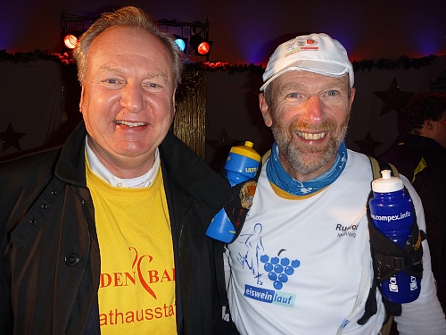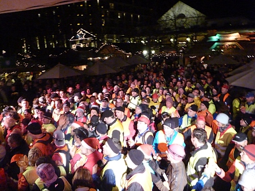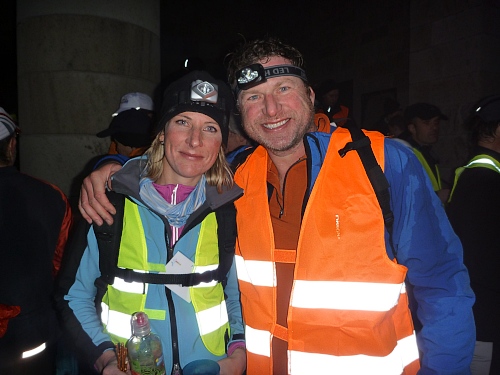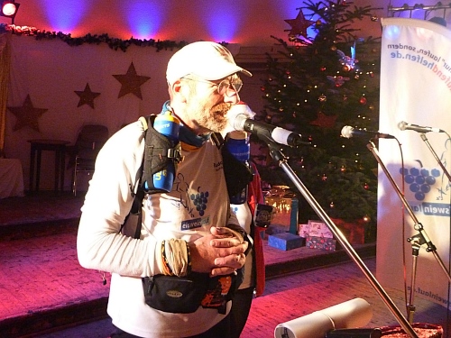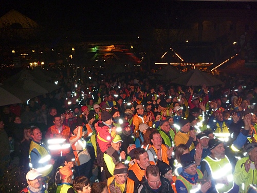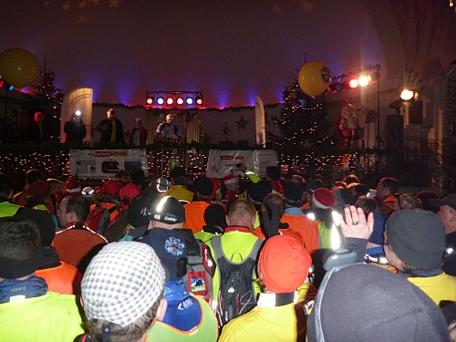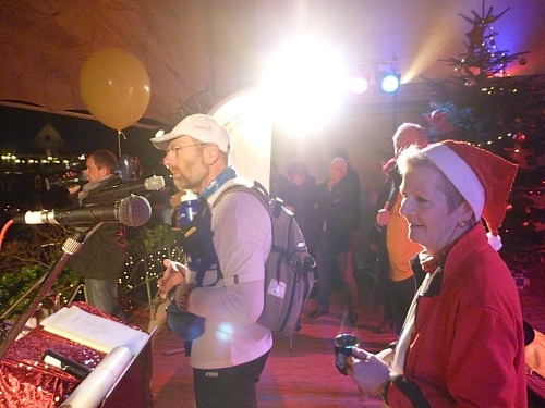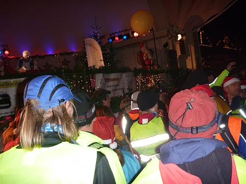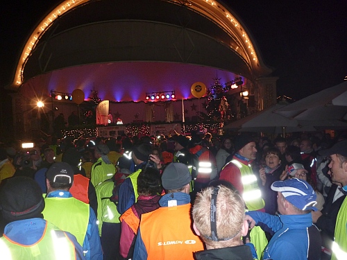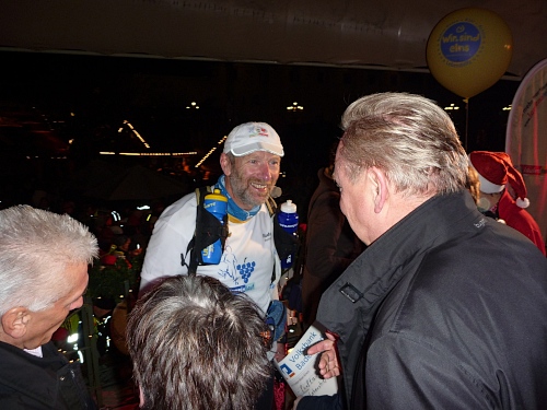 Kampf bis zur Bühne. Oberbürgermeister und viele Offizielle. Unheimlicher Rückhalt in der Politik für diesen Lauf, Rolf in seinem Marathon-des-Sables-Outfit wie ein Außerirdischer mittendrin. Ein Trubel, als hätten wir die Fussballweltmeisterschaft gewonnen. Gleissendes Licht durch Scheinwerfer und Kameraleute. Securities mit breiten Schultern halten den Weg frei. Doch die Menge brüllt, von der Seite grapschen leuchtende Augen nach meinem glänzenden Ultraoutfit, wollen mich heiraten. Über mir quirlt warmer Dampf im Scheinwerferlicht, vermengt sich mit gebrannten Mandeln und duftenden Maroni. Dann erreiche ich die Bühne, versuche die Stufen zu erklimmen, falle hin, werde aufgefangen (wahrscheinlich wieder was Heiratswilliges), dann bin ich oben und kann endlich Fotos schießen. Dabei wabert diese ganze Stimmung über meinem Kopf zusammen, taucht mich in einen tranceartigen Traum. Ich bin 65 km gelaufen, schnappe nach Luft, bin Teil des Heldentums.