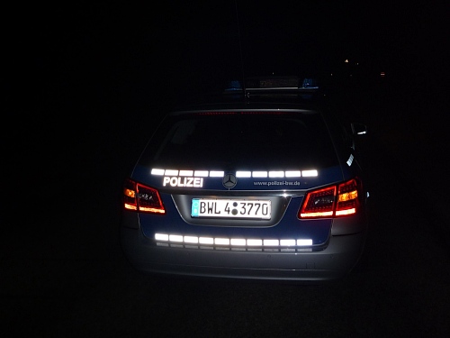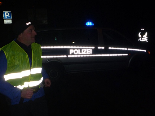 Von Weitem sehen wir schon das Blaulicht. Das erste Mal, dass der Eisweinlauf Polizeischutz bekommt. Rolf hat ja auch zwei dicke Spendenschecks dabei.