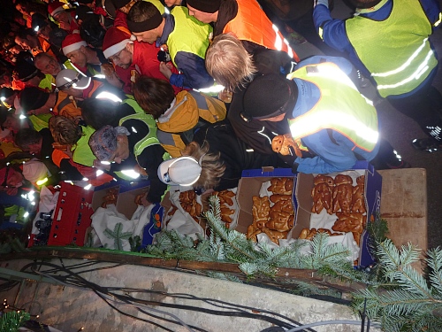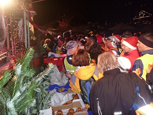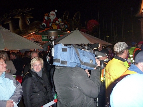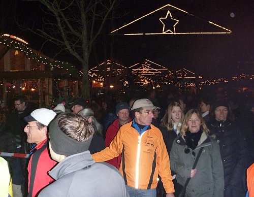 Der absolute Hit: Im vollen Tempo laufen wir auf den Baden-Badener Weihnachtsmarkt ein. Unser Weg ist mit Absperrband freigehalten. Wir sind fest im offiziellen Veranstaltungskalender des Marktes, haben den Ehrenplatz vor der Konzertmuschel vor dem Kurhaus. Dorthin kämpfen wir uns nun durch. Kurgäste in spiessigen, dicken Wintermänteln mit Hut, Pelz und Ohrwärmern, nasse Augen im Glühwein-Tannenduft, und wir nassgeschwitzen und ultraduftende Kämpfer mittendrin. Das Gedränge ist groß, Hände werden platzsparend nach oben geworfen. Jede Menge Presse, vorne gibts Glühwein und Dambedeis, wie die Hefemänner hier heissen, alles inklusive, nur für uns!