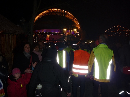 „Bitte folgen“ leuchtet uns entgegen als wir hinter dem Streifenwagen herwetzen. Nie haben wir diesen Spruch herbeigesehnt, jetzt ist es wie der Einlauf ins Olympiastadion. Dann der Duft von Glühwein, Zimt, Bratwurst und mehr.