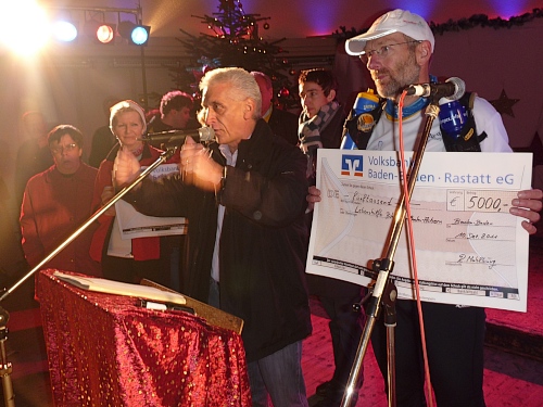 Eine Wooge geht durch die Menge, als Brigitte und Rolf zwei Schecks in Höhe von jeweils 5000 Euro in die Höhe halten, einen für die Lebenshilfe Baden-Baden/Bühl/Achern e.V. und einen für die aktion benni & Co e.V., die sich um die Duchenne-Kinder kümmert. Der Dank gilt auch uns, die wir das mit unserem Start ermöglicht haben.