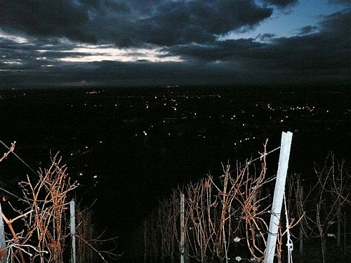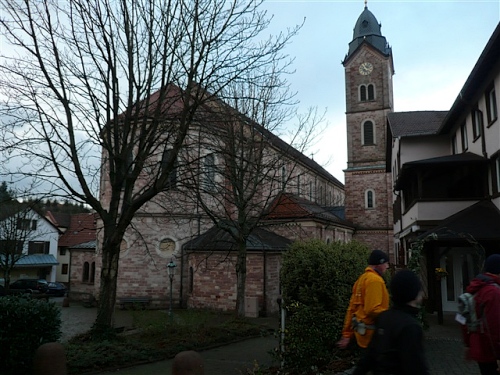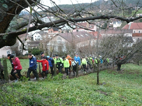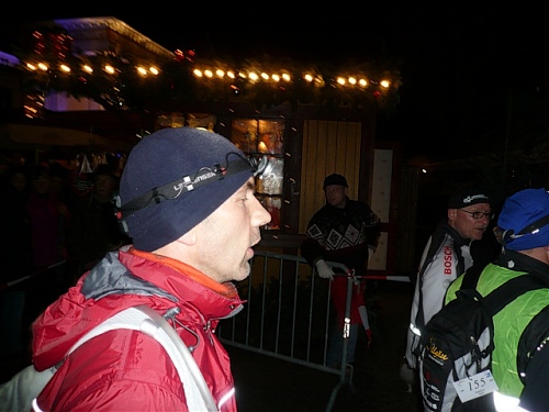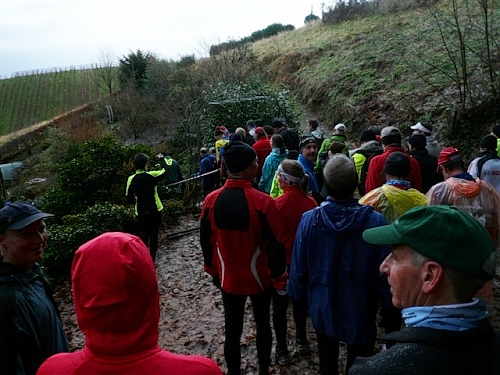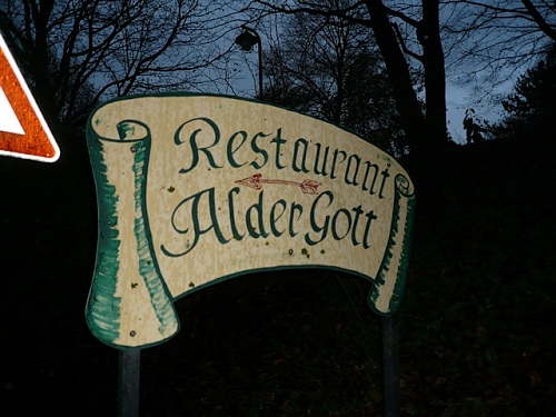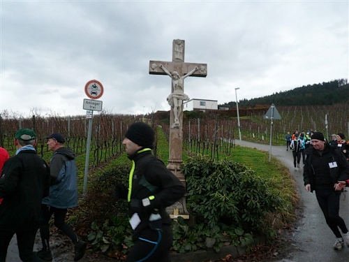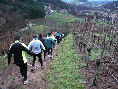Es wird immer dunkler, Tom Eller sagt mir an einer Kapelle, daß es hier bei seiner sechsten Teilnahme zum ersten Mal finster ist, wir sind also spät dran. Vorbei am berühmten Weingut/Restaurant „Alder Gott“ finden wir vor der Kirche von Neuweier die letzte Verpflegungsstelle, diesmal überdacht, dafür dunkel. Erst unmittelbar vor unserem Aufbruch gehen die Lichter an, ich bin aber zuversichtlich, daß sich keiner in die Finger gebissen hat.