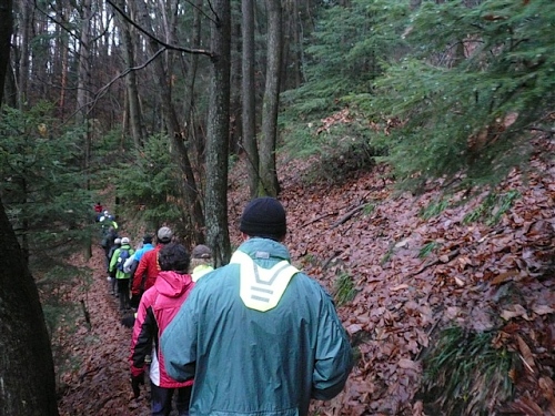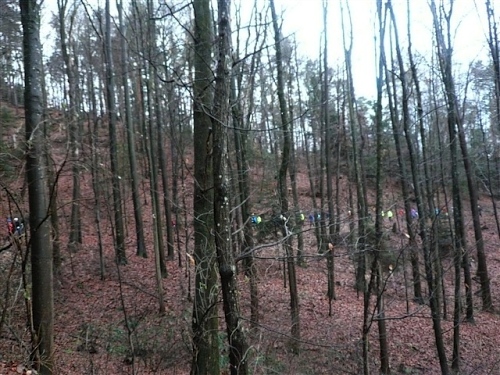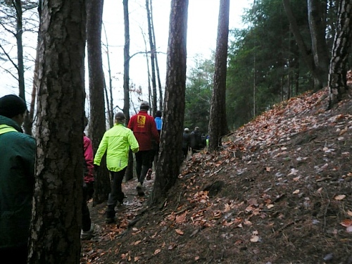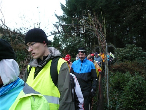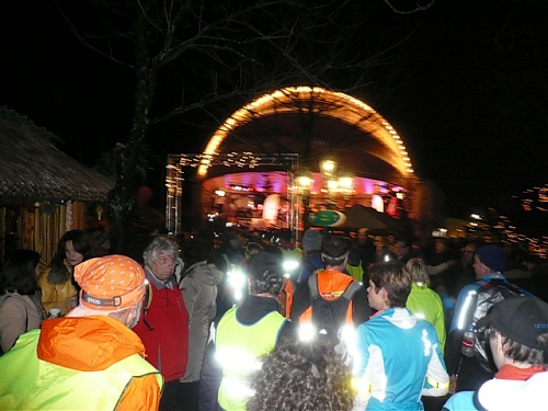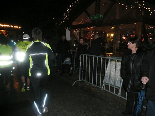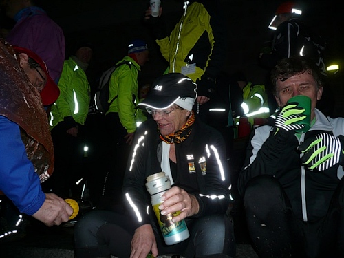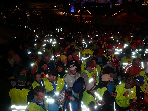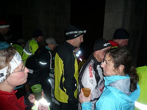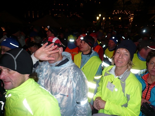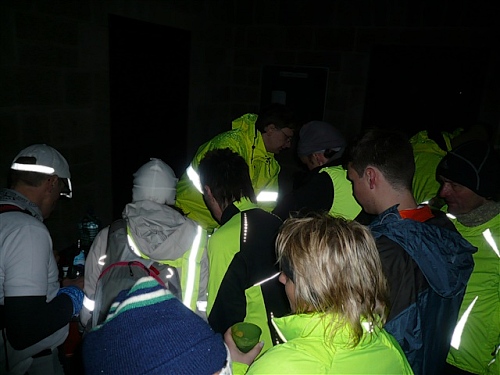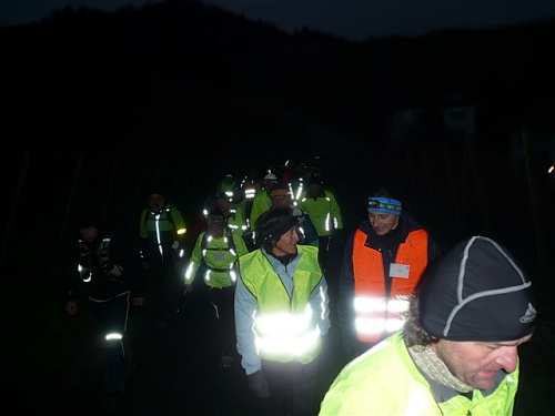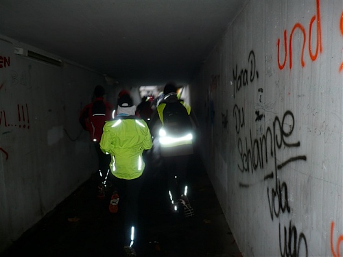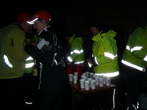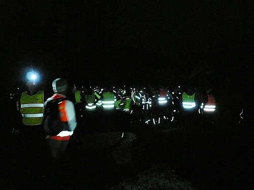 Ab jetzt ausgerüstet mit Stirnlampe und Warnweste (meine Angeberweste mit Aufdruck des TEFR kommt erstmals zum Einsatz und provoziert die erhoffte ehrfürchtige, aber unberechtigte Nachfrage) – dies ist eine der Bedingungen für die behördliche Genehmigung des Laufs – geht es auf die letzte Etappe. Ich muß zugeben, es wird zäh, aber wann ist das bei einem Lauf mal anders, egal wie lange er dauert? Bald benötigen wir die Lampen wirklich, die Kamera streikt bei der Finsternis und alle hoffen, daß es bald vorbei sein möge, so schön es trotz der ungünstigen Witterung bisher war.