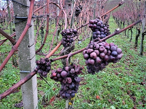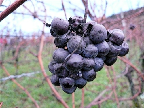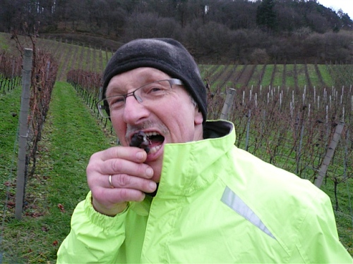 Nach vielen, vielen Bergabstücken unterqueren wir eine Straße, mit unseren schlammverschmierten Schuhen die Treppen herunter und hinauf eine echte Herausforderung. Wie gewonnen, so zerronnen, schon sind auf der Gegenseite wieder etliche Höhenmeter zu nehmen. Da – endlich! Tatsächlich finde ich einen Wingert, in dem noch etliche Trauben hängen, die bisher der Vernichtung durch Mensch und/oder Tier entgangen sind. So komme ich dann doch an ein paar Fotos, die dem Namen dieses Laufs gerecht werden. Auch an das von einem in flagranti erwischten Mundräuber.