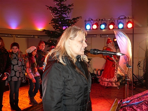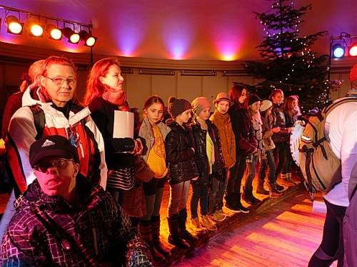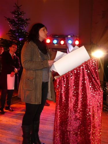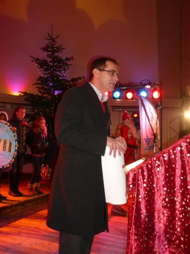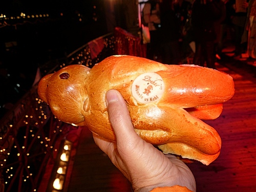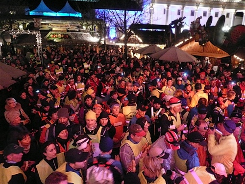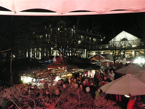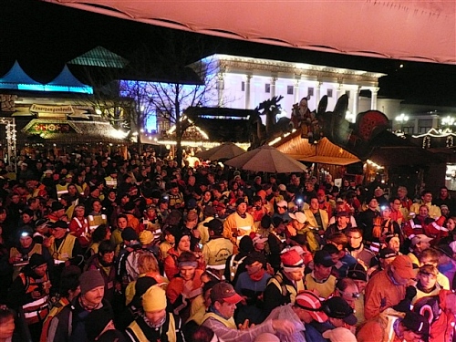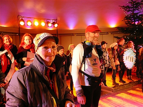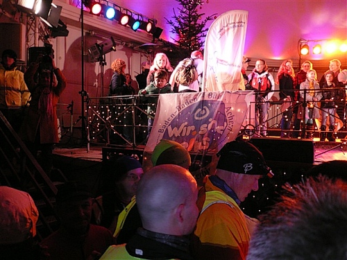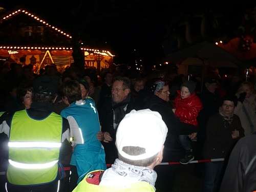Dann erreichen wir, erneut polizeibegleitet („Bitte folgen“ leuchtet es aus dem Heckfenster – sonst werde ich darüber nervös), die ersten Gebäude von Baden-Baden und schneller als erhofft, fast bin ich überrascht, höre ich „Zieleinlauf!“. Quer über den Weihnachtsmarkt hat man einen Einlaufkanal abgesperrt, der vor der hellerleuchteten Konzertmuschel die gesamte Breite einnimmt. Direkt vor ihr gibt es für uns Tee, Glühwein und Dambedeis, für Nicht-Badener: Weckmänner. Für Nicht-Rheinländer: Zartes Hefegebäck in Menschenform, das der sofortigen Vernichtung bedarf. Allerdings nicht durch mich, denn bevor ich zugreifen kann, befiehlt mich ein scharfer Blick von Rolf auf die Bühne, um das weitere Geschehen im Bild festzuhalten. Unvermeidliches Schicksal des Chronisten, auch wenn er ausgelaufen hat.