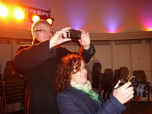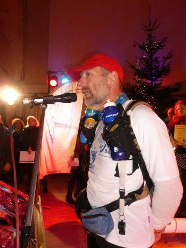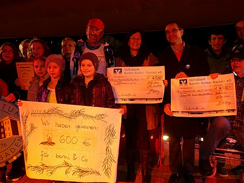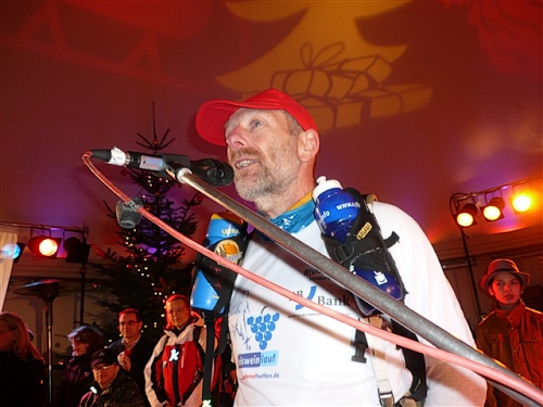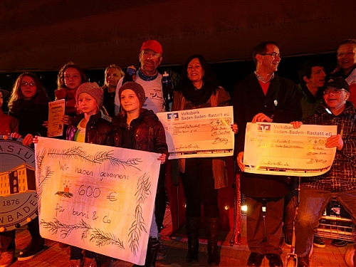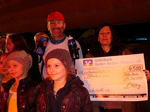 Dort steht schon eine Abordnung des Gymnasiums Hohenbaden, das in einer Spielshow 600 € gewonnen hat und diese Summe dankenswerterweise der Aktion „benni & co.“ zur Verfügung stellt. Von einer Stadtvertreterin herzlich begrüßt, richtet Rolf vom hohen Podest ein paar flammende Worte an seine Untertanen, die ihn dafür mit heftigem Applaus überschütten. Zwei Schecks à 4.500 € gehen an „benni & co.“ sowie an die Baden-Badener Lebenshilfe, nur alleine mit dem heutigen Eisweinlauf erwirtschaftet. Fürs komplette Jahr rechnet Rolf mit einer Gesamt-Spendensumme von rund 31.000 €. Ein Wahnsinnserfolg und der gerechte Lohn für ein Engagement der beiden Mahlburgs, das über ein Hobby weit hinausgeht und mittlerweile beider Leben zumindest mitbestimmt.