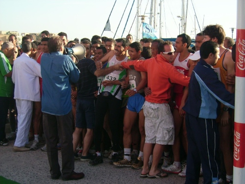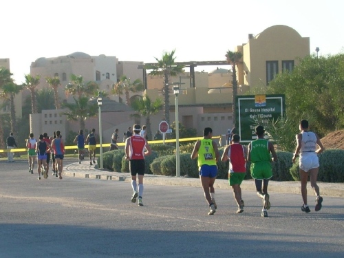 08.00 Uhr, eigentlicher Startzeitpunkt. Aber wir sind in Ägypten, es wird später. Die Meute steht noch minutenlang auf der Zeitmessmatte und lässt sich auch nicht mit lautstarken Aufforderungen zurück drängen, sondern erst mit körperlicher Gewalt. Dann gibt es erst einmal einem klassischen Fehlstart. Schließlich jagt die Meute auf und davon. Einige Ungeübte müssen allerdings nach 100 Meter schon Gehpausen machen.