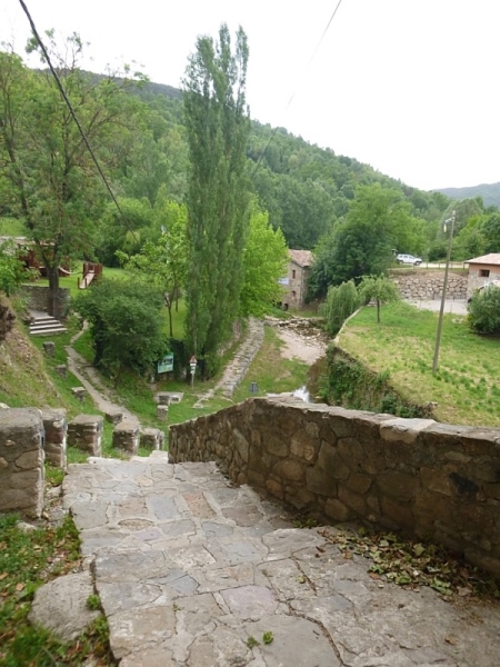 Dann ertönte laute Musik, zum Start gab es auf dem Platz ein Minifeuerwerk, von dem ich leider nichts sehen konnte. Für mich fiel nun der Startschuss für meinen ersten Trail auf katalanischem Boden und ich war mächtig gespannt auf die Strecke. Mit einer Runde durch Sant Joan de les Abadesses verließen wir auch schon bald die engen Gassen über die Brücke „El Pont Vell“, einer Steinbrücke über den Rui Ter. Nachdem wir die Häuser hinter uns gelassen hatten, ging es auf einem schattigen Weg in die Berge der Serra Cavallera nördlich von Sant Joan. Der steinige Weg war hier schon so steil, dass ich wie auch viele andere Trailläufer in einen flotten Wanderschritt wechselte. Die erste Verpflegung (hier CP genannt) befand sich bei km 6,4 und mehr als 600 Höhenmeter im Aufstieg an der Überquerung einer einspurigen Asphaltstraße, an der es ausschließlich Getränke gab.