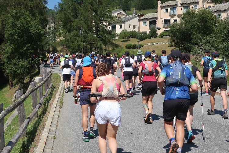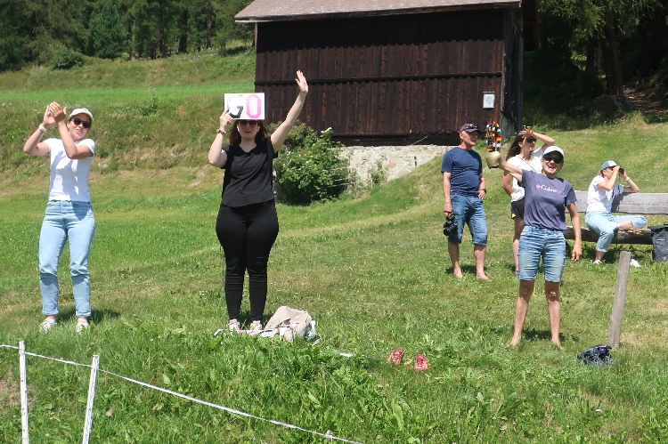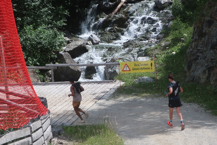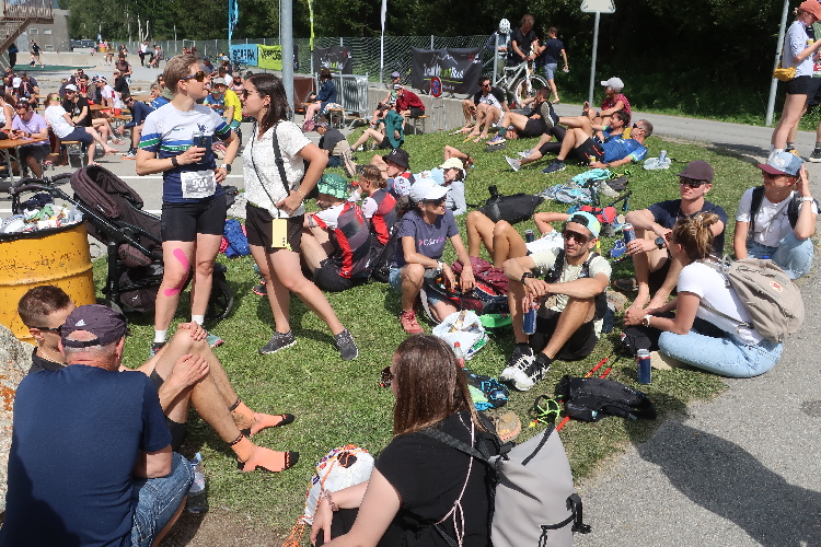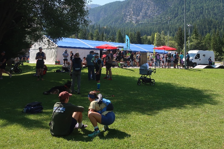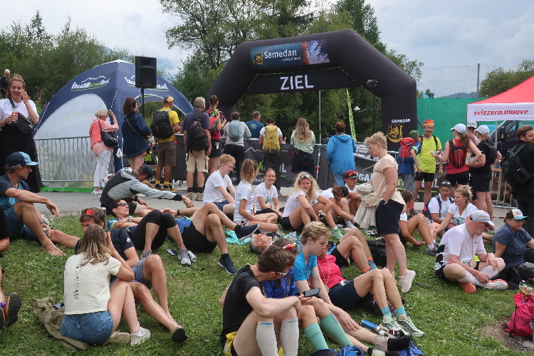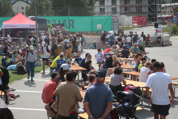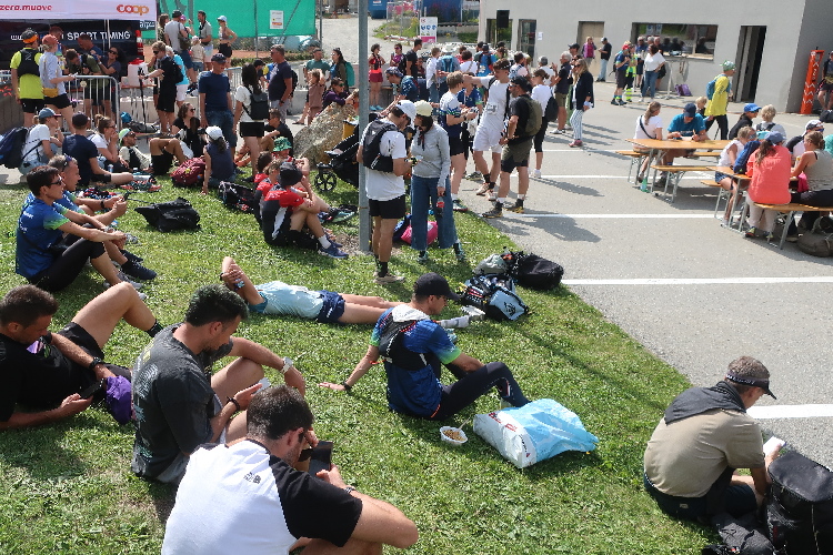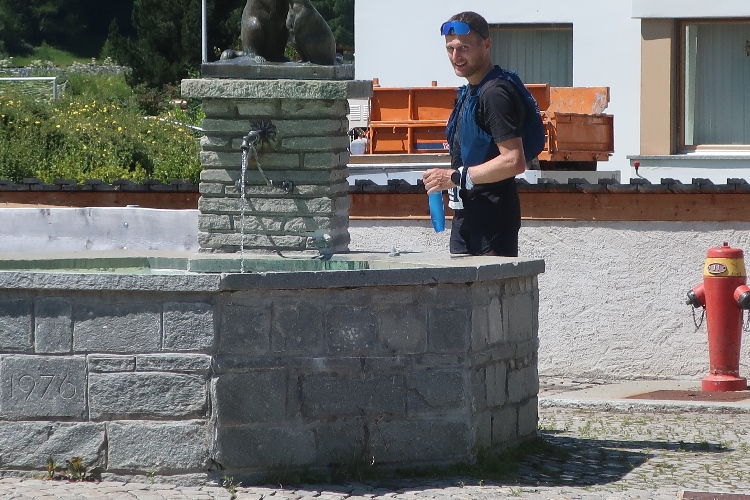 Mein erster Anlaufpunkt am Samstagmorgen ist das Schulhaus von La Punt bzw. das hier an einer Wiese positionierte Zelt. Im Zelt bekomme ich meine Startnummer und den Zeitmesschip; ein nettes Teilnehmershirt gibt es obendrauf. Danach suche ich vor allem eines: Schatten. Zum Glück gibt es ein paar größere Bäume hier. Zwar ist es erst 10 Uhr, aber bereits überaus heiß und zudem schwül. Sehr angenehm ist da auch, dass man sich im Zelt kühles Wasser zapfen kann.