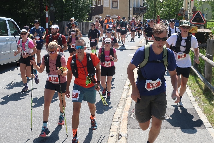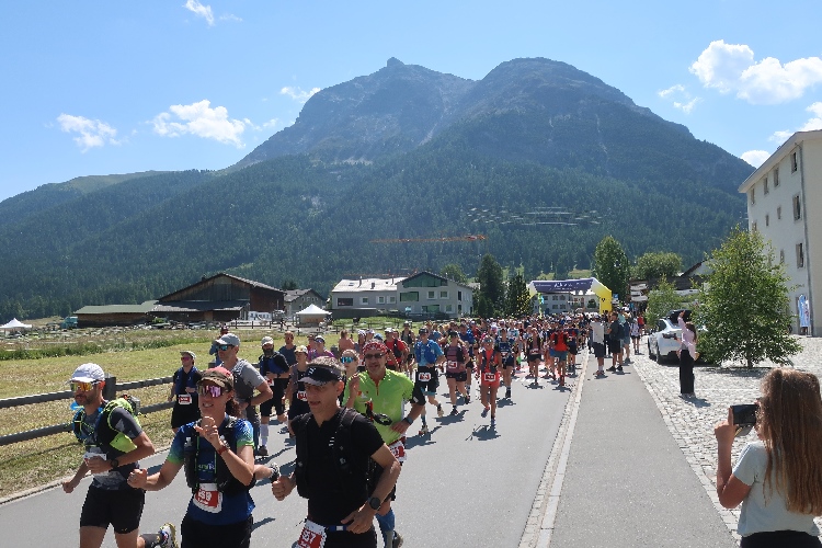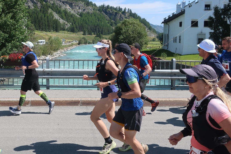 11:11 Uhr ist der offizielle Startzeitpunkt und als ich morriconische Westernklänge höre, weiß ich, es ist soweit. Ein Pistolenknall erlöst die wartende Läuferschar. Die Straße gerade hinunter geht es dem Ortszentrum entgegen. Wir queren den das Dorf durchschneidenden, lichtblau schimmernden Inn und die Durchgangsstraße und finden uns dann auf der Albula Passstraße wieder. Diese verbindet La Punt mit Bergün und damit das Engadin mit dem Albulatal. Auf der bergan führenden Passstraße werden wir sogleich konditionell erstmals geprüft. Und bei dieser Prüfung schneide ich gar nicht gut ab.