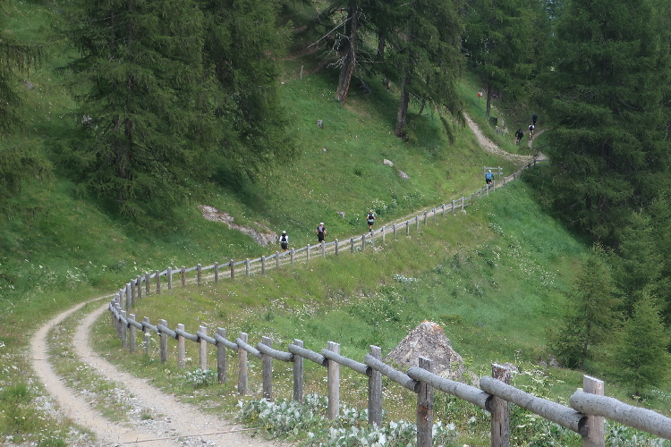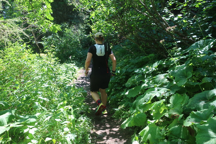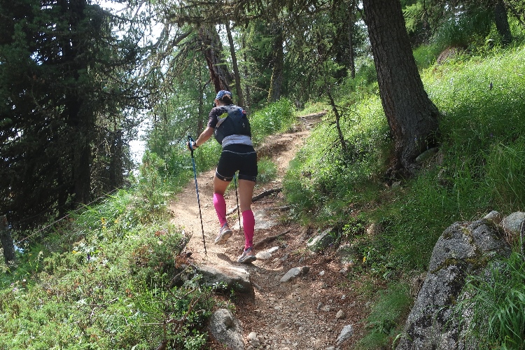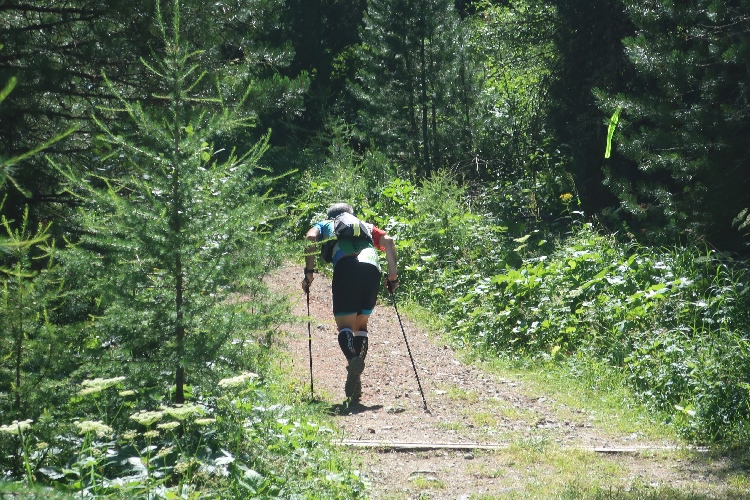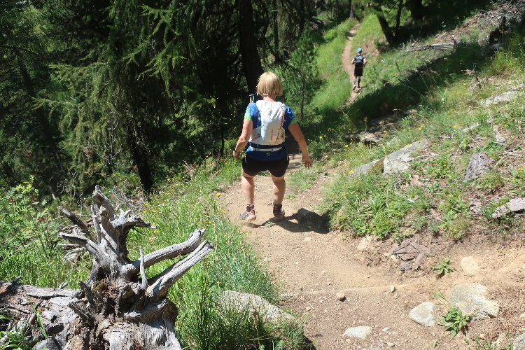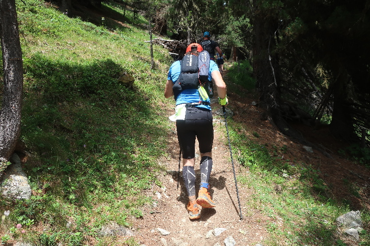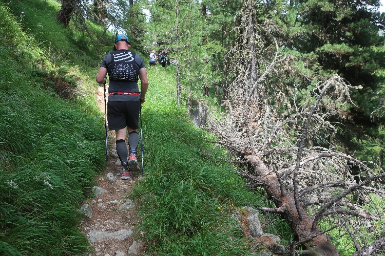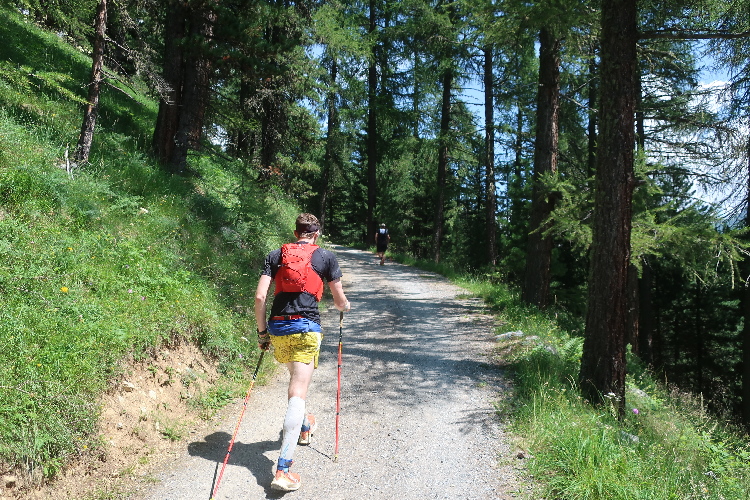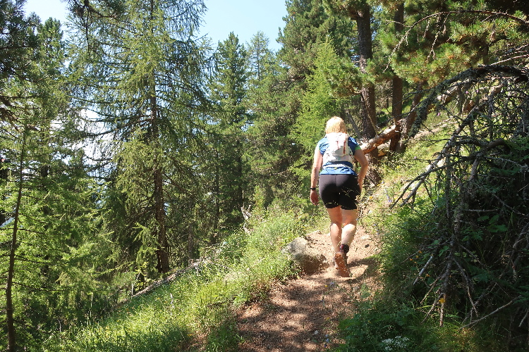 Und so ist es auch. In langen Serpentinen geht es über einen Forstweg durch den Wald nicht allzu steil, aber permanent bergauf. Für Mountainbiker weisen große Hinweistafeln im 500-Meter-Abstand darauf hin, wie weit es noch zur Alp ist. Auch für die Läufer ist das hilfreich, um besser einschätzen zu können, wie lang der kräftezehrende Anstieg noch andauert. Das ändert sich allerdings, als wir auf einen schmalen Pfad abgeleitet werden, der über reichlich Wurzelwerk und Gestein nun steil und unerbittlich in die Höhe führt. Im Zeitlupentempo stapfen die Läufer um mich herum mühsam Schritt für Schritt den Steilhang empor.