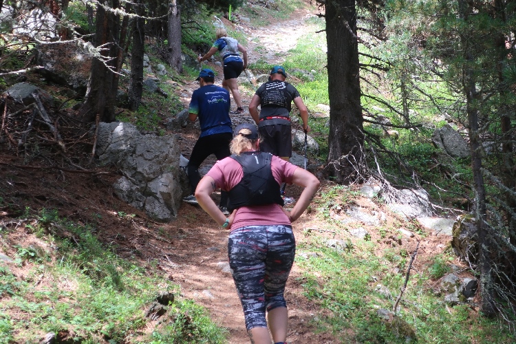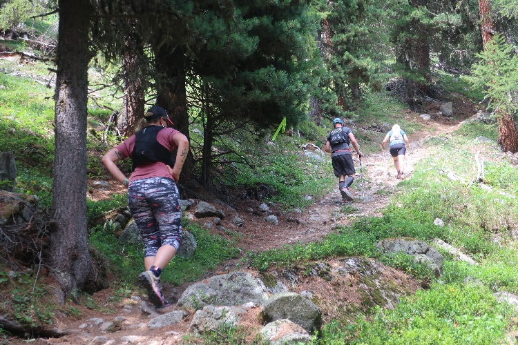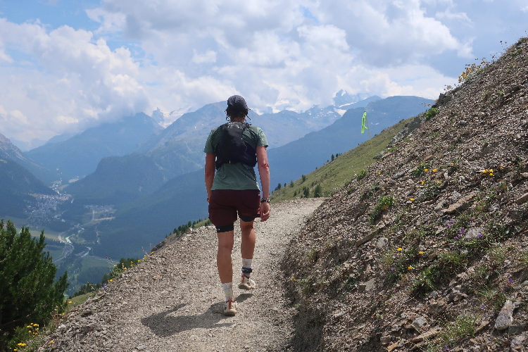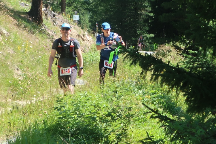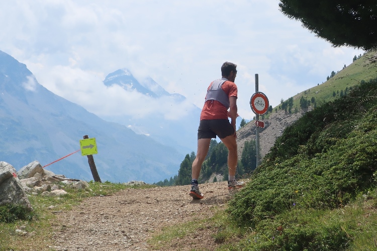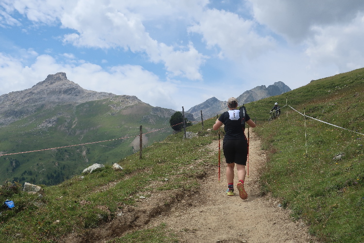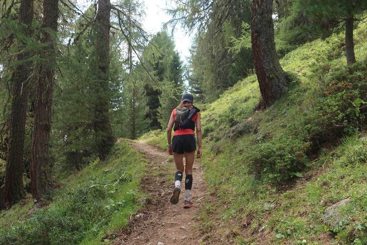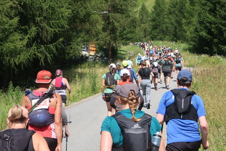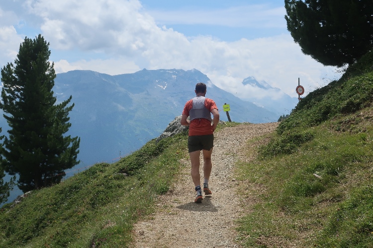 Und so ist es auch. In langen Serpentinen geht es über einen Forstweg durch den Wald nicht allzu steil, aber permanent bergauf. Für Mountainbiker weisen große Hinweistafeln im 500-Meter-Abstand darauf hin, wie weit es noch zur Alp ist. Auch für die Läufer ist das hilfreich, um besser einschätzen zu können, wie lang der kräftezehrende Anstieg noch andauert. Das ändert sich allerdings, als wir auf einen schmalen Pfad abgeleitet werden, der über reichlich Wurzelwerk und Gestein nun steil und unerbittlich in die Höhe führt. Im Zeitlupentempo stapfen die Läufer um mich herum mühsam Schritt für Schritt den Steilhang empor.