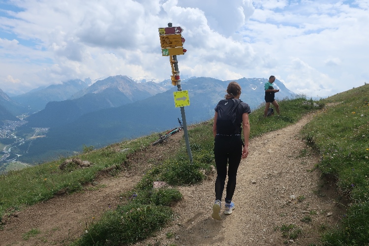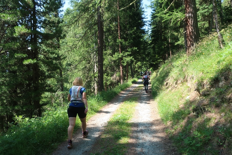 Der Anstieg setzt sich auch fort, als wir im Dorfteil Arvins von der Passstraße auf den Fernwanderweg Via Engiadina abzweigen. Dieser erschließt mit einer Länge von 160 Kilometern das gesamte Engadin. Auf einem zu Beginn breiten und sich dann zu einem Pfad verengenden Naturweg geht es die nächsten Kilometer immer geradeaus am bewaldeten Hang entlang. Weiter und weiter geht es zunächst hinauf. Auf dem Streckenplan sah dieser „Zacken“ eigentlich nur ganz klein aus. Etwas Erholung verspricht ein kurzer Downhill, aber schon wartet der nächste kleine Zacken auf uns. Ab und an öffnet der Wald seinen Vorhang und bietet einen Panoramablick über das weite Grün des Engadiner Talbodens und die bewaldeten Berghänge auf der anderen Talseite.