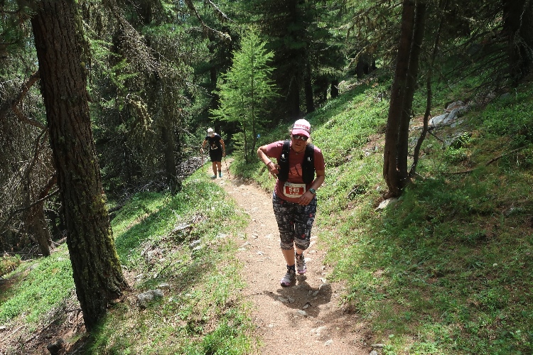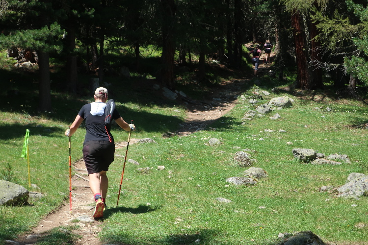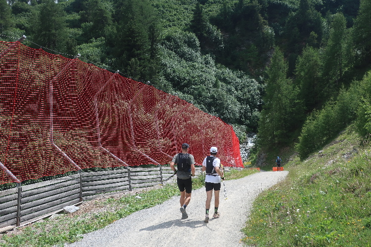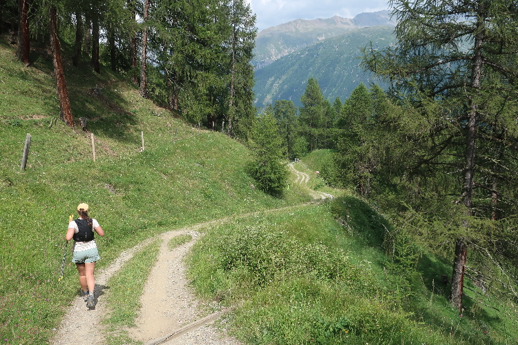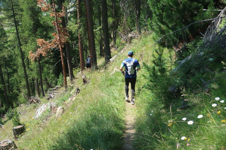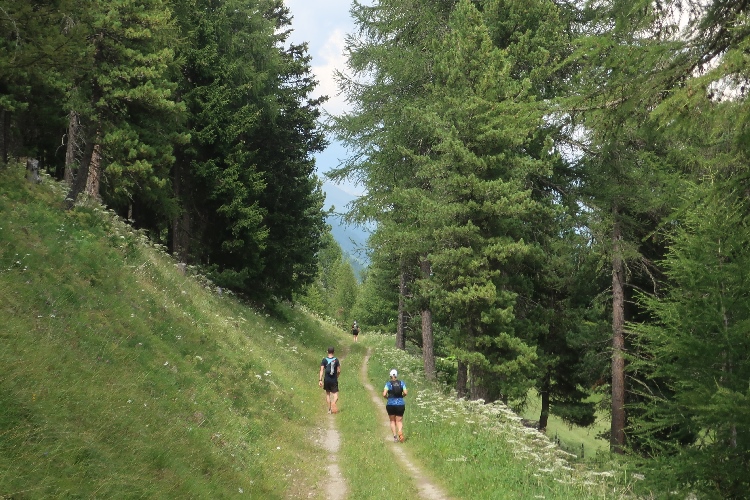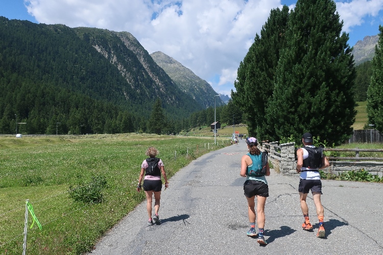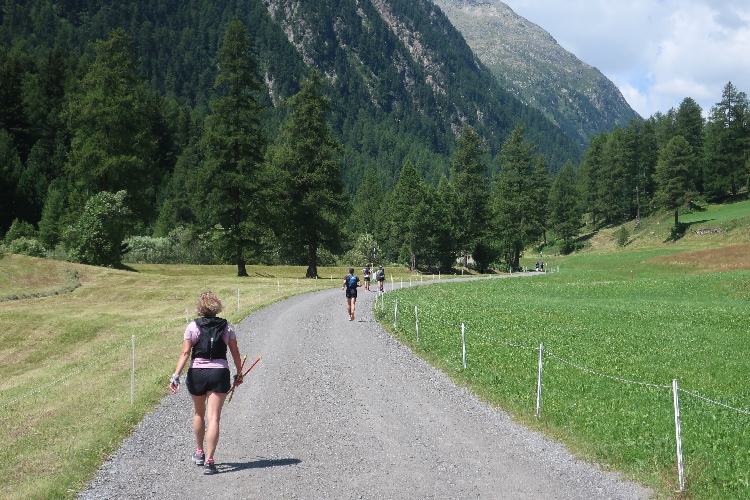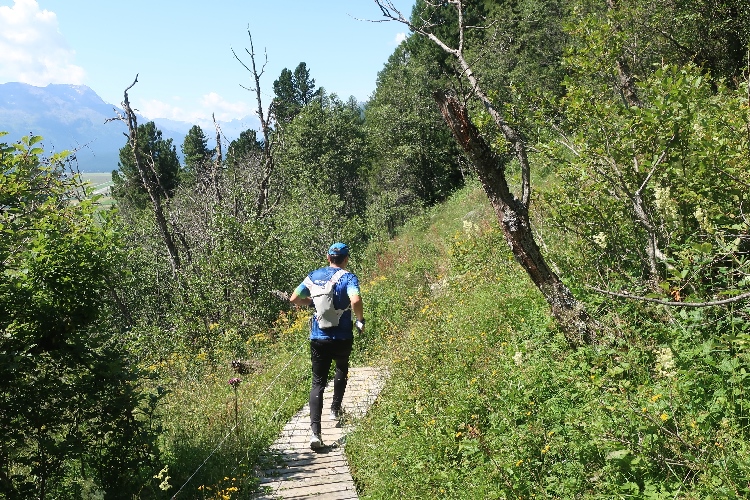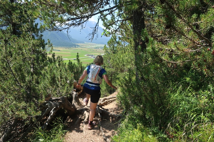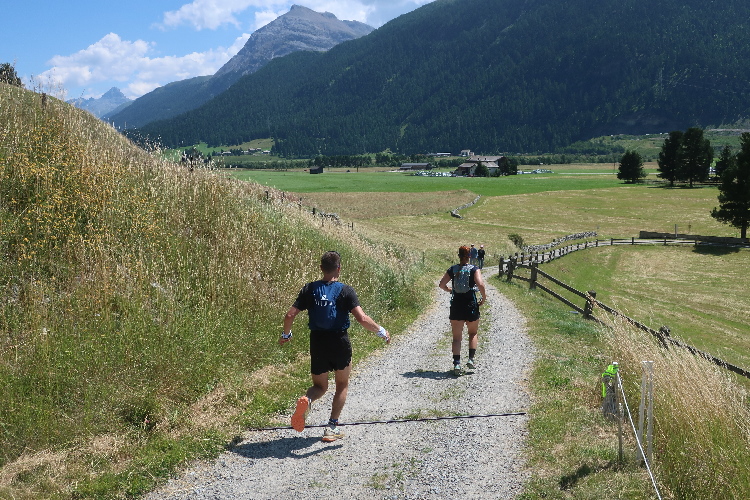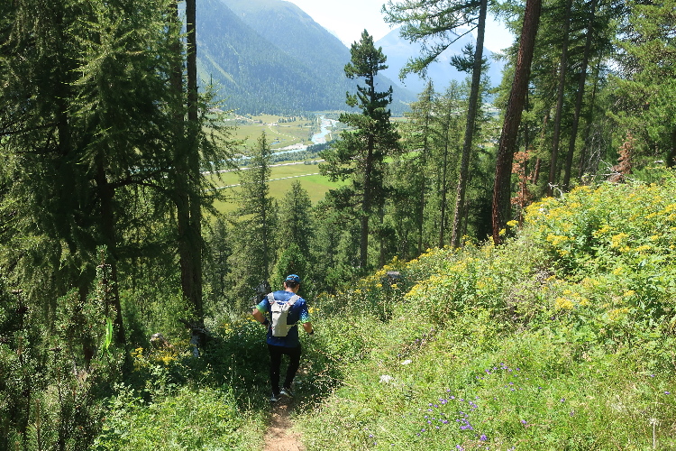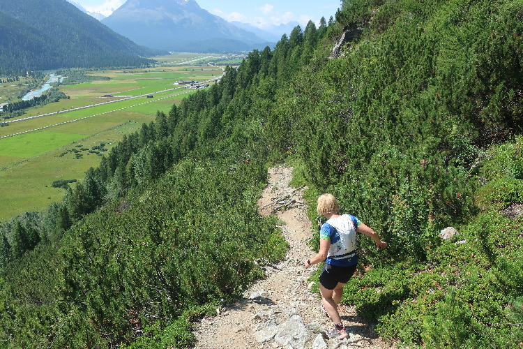 Moderat, was das Streckenprofil angeht, geht es zunächst weiter. Ein Stück weit führt der Kurs durch weite Wiesen ins Val Bever hinein, wo wir schließlich über Brücken zunächst das Flüsschen Beverin und dann die Albula-Linie der Rhätischen Bahn queren. Unser Pfad führt nun wieder talauswärts, in leichtem Auf und Ab durch dichtes Buschwerk und folgend luftigen Nadelwald.